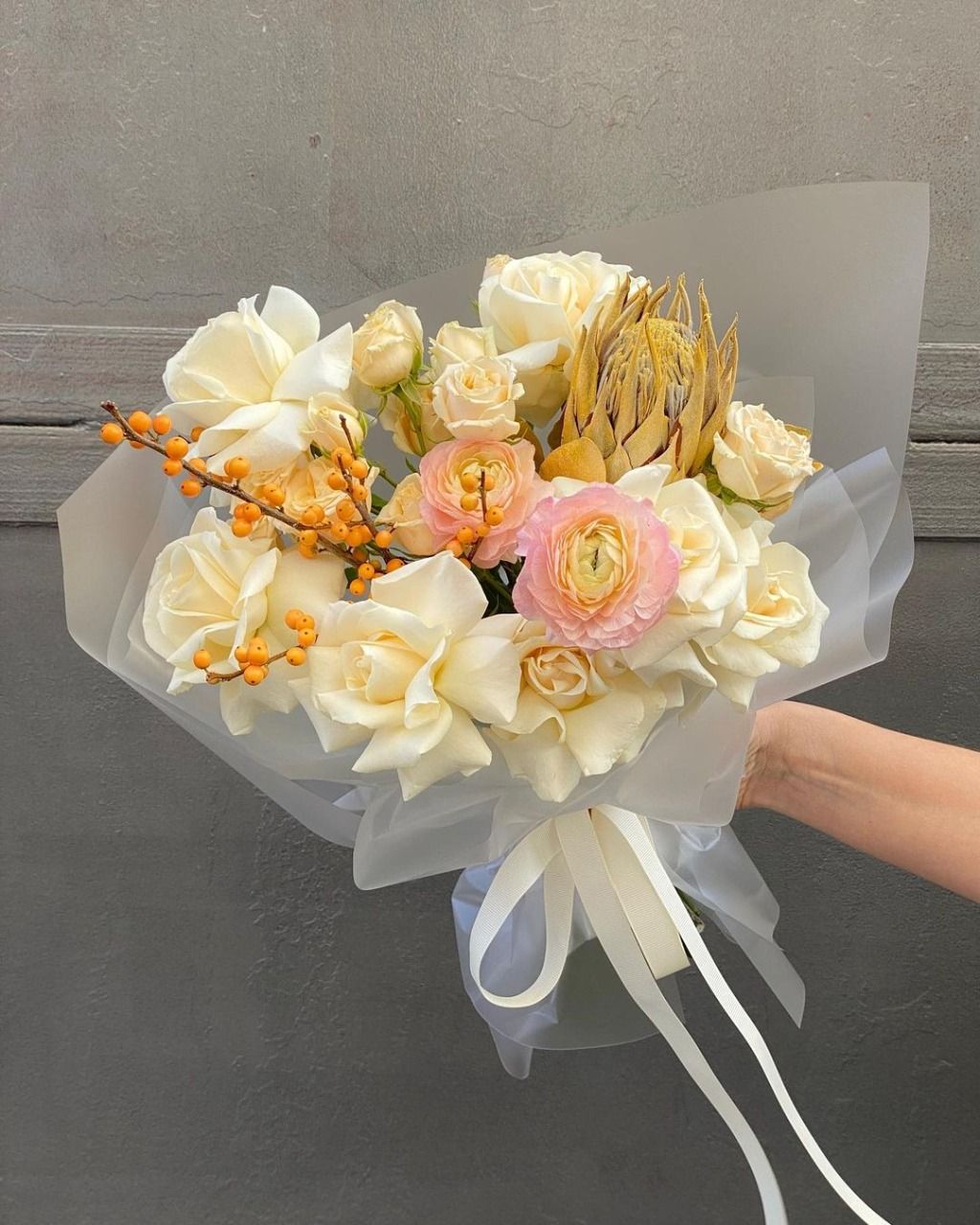 Ранункулюс (Голландия) - 2; Протея большая (Голландия) - 1; Илекс (Голландия) - 1; Роза голландская 60 см - 7; Спрей роза (Кения) - 2; Калька в ассортименте - 4; Открытка - 1; Шпажка для открытки - 1;