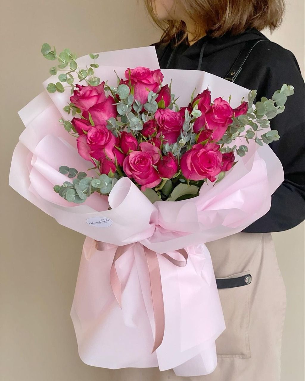 Спрей роза (Кения) - 7; Эвкалипт (Голландия) - 3; Калька в ассортименте - 4; Открытка - 1; Шпажка для открытки - 1;