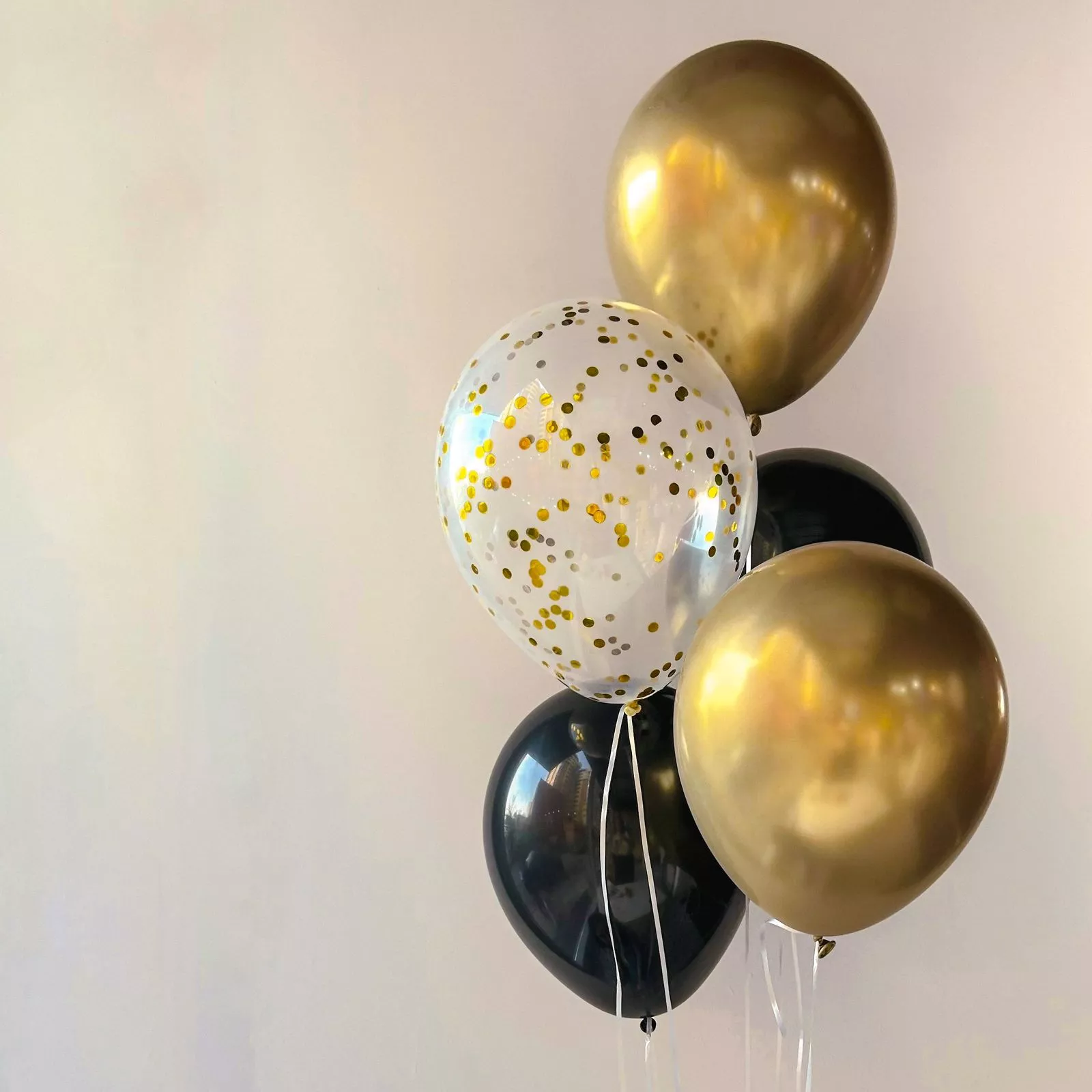 Шар хром 30 см - 2; Шар однотонный 30 см - 2; Шар с конфетти 30 см - 1; Грузик для шаров - 1; Пакет для транспортировки шаров - 1;