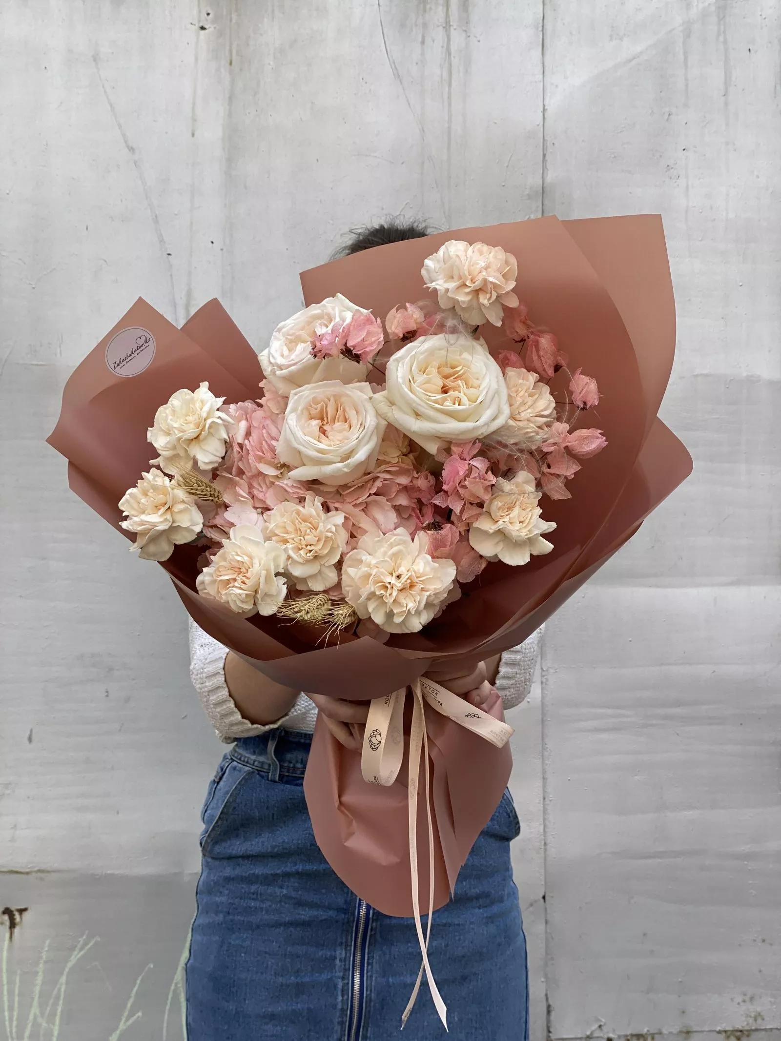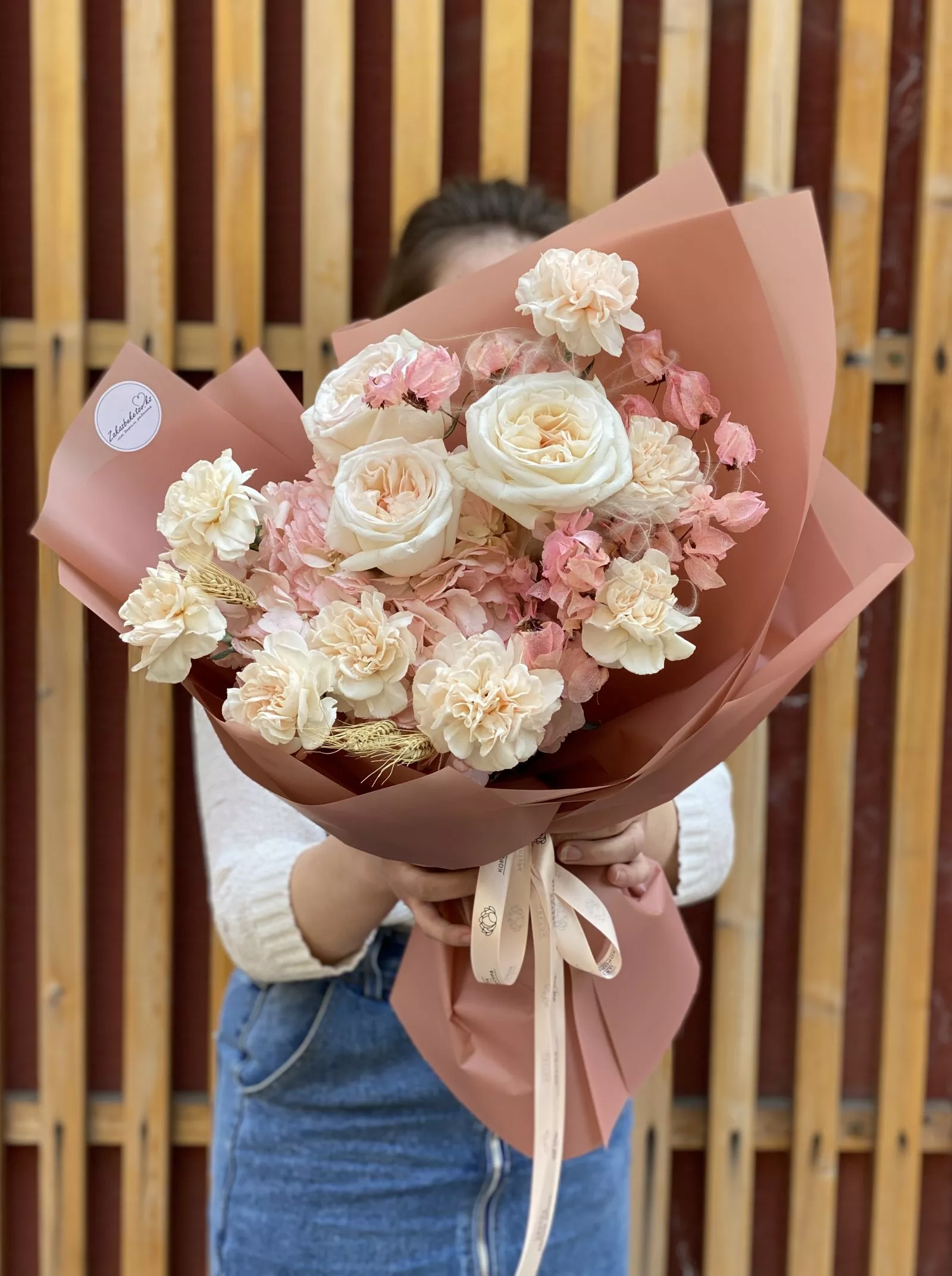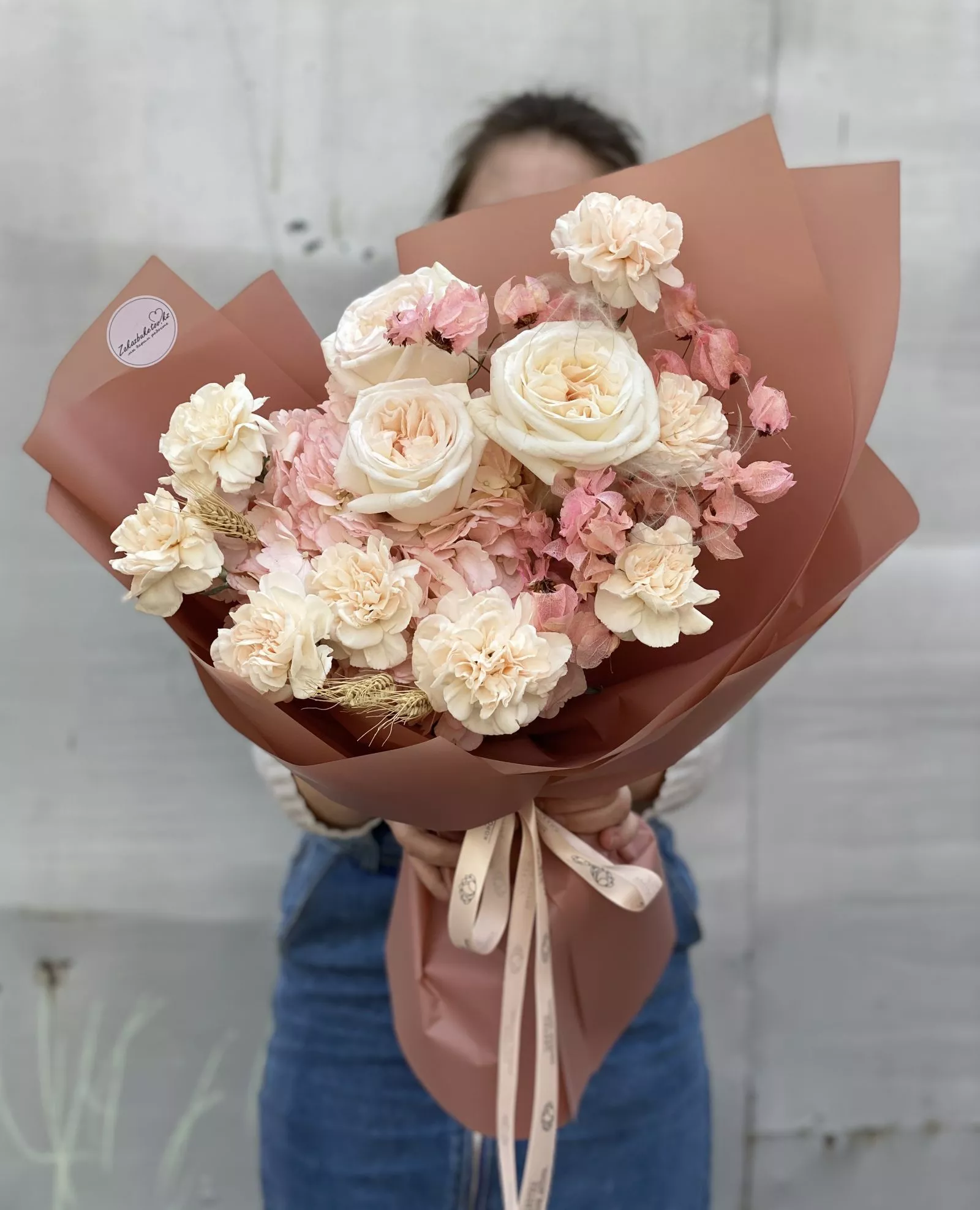 Гортензия (Колумбия) - 1; Пионовидная роза (Англия) - 3; Стифа (декоративные перья) - 2; Латирус (Голландия) - 1; Гвоздика (Голландия) - 8; Пшеница (Голландия) - 1; Калька в ассортименте - 4; Открытка - 1; Шпажка для открытки - 1;