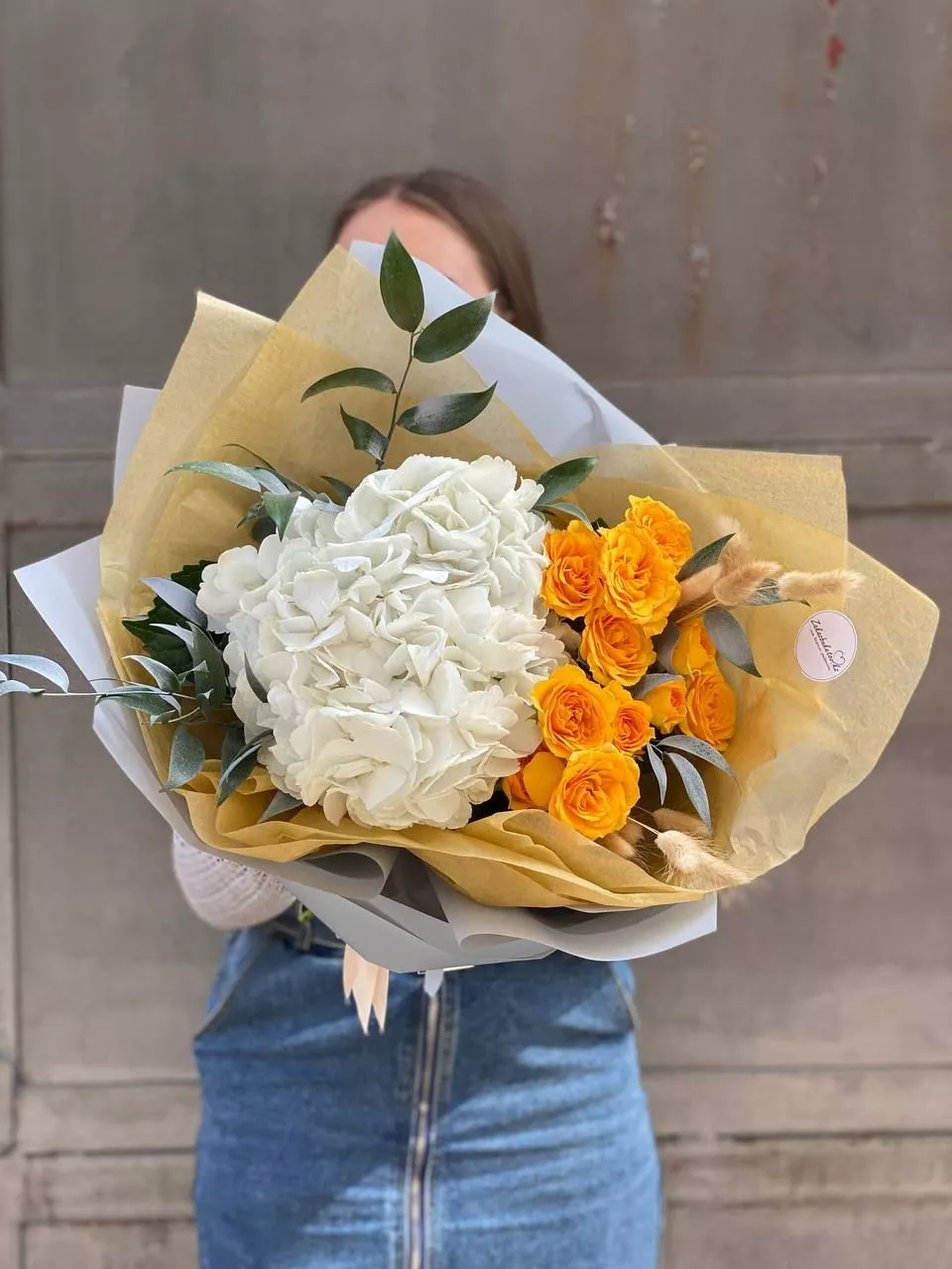Спрей роза (Кения) - 3; Гортензия (Колумбия) - 1; Рускус итальянский (Голландия) - 2; Калька в ассортименте - 4; Лагурус (Голландия) - 5; Открытка - 1; Шпажка для открытки - 1;