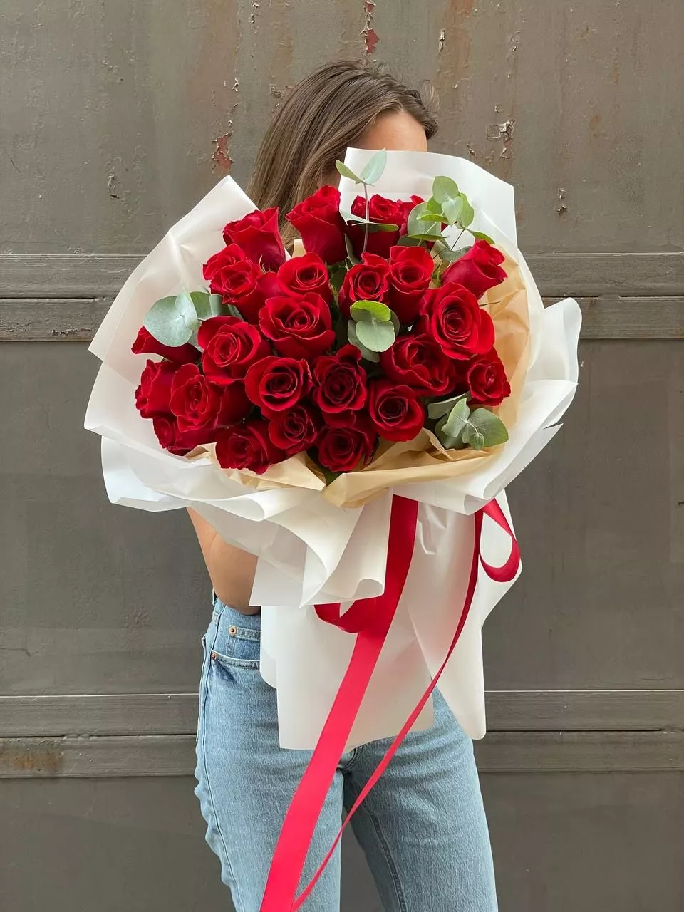 Роза голландская 60 см - 25; Эвкалипт (Голландия) - 3; Тишью - 2; Калька в ассортименте - 2; Открытка - 1; Шпажка для открытки - 1;