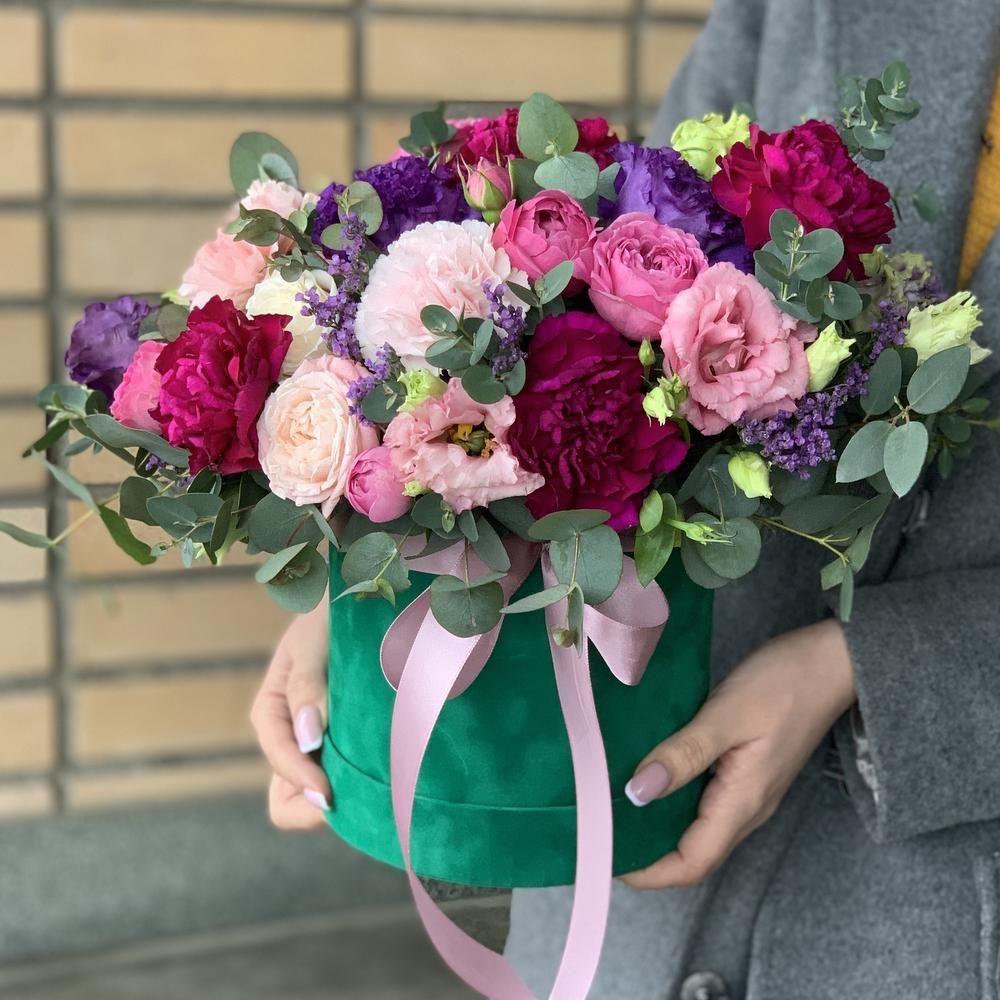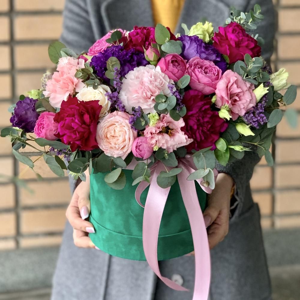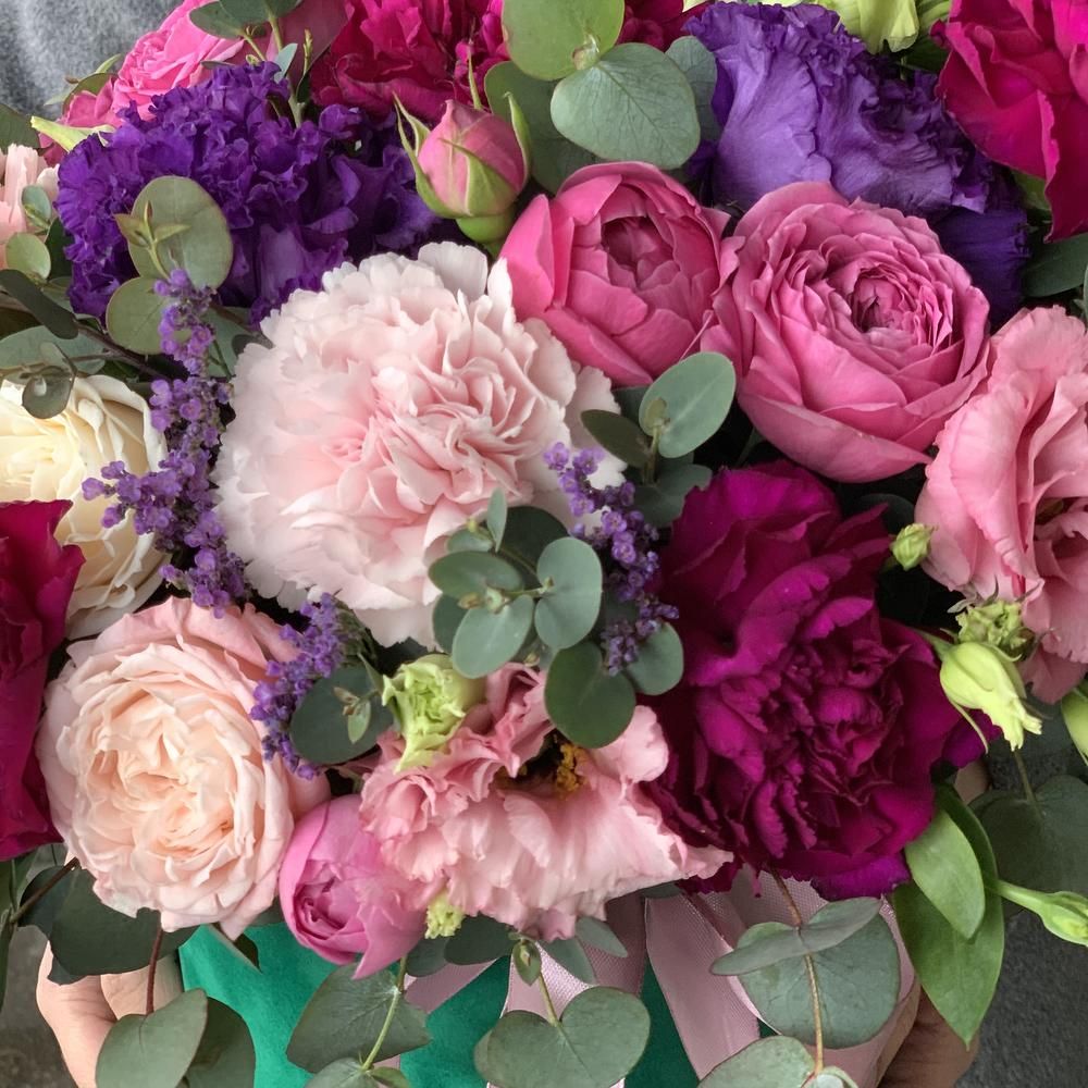 Спрей роза пионовидная (Кения) - 3; Лизиантус (Израиль) - 3; Лимониум (Голландия) - 1; Спрей роза (Кения) - 2; Гвоздика (Голландия) - 7; Фисташка (Голландия) - 3; Эвкалипт (Голландия) - 3; Коробка Cтандартная (из комплекта 2в1) - 1; Открытка - 1; Шпажка для открытки - 1;