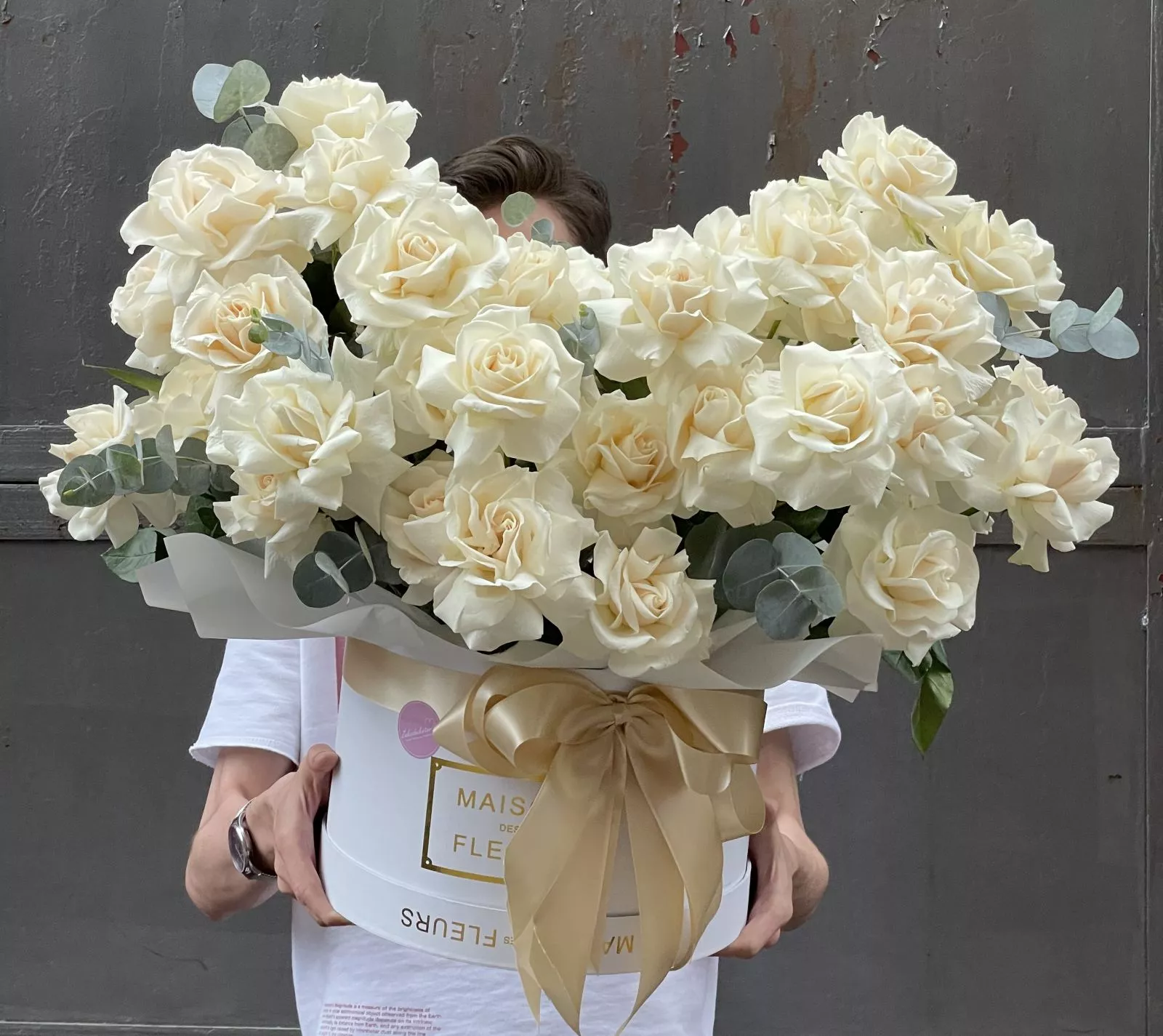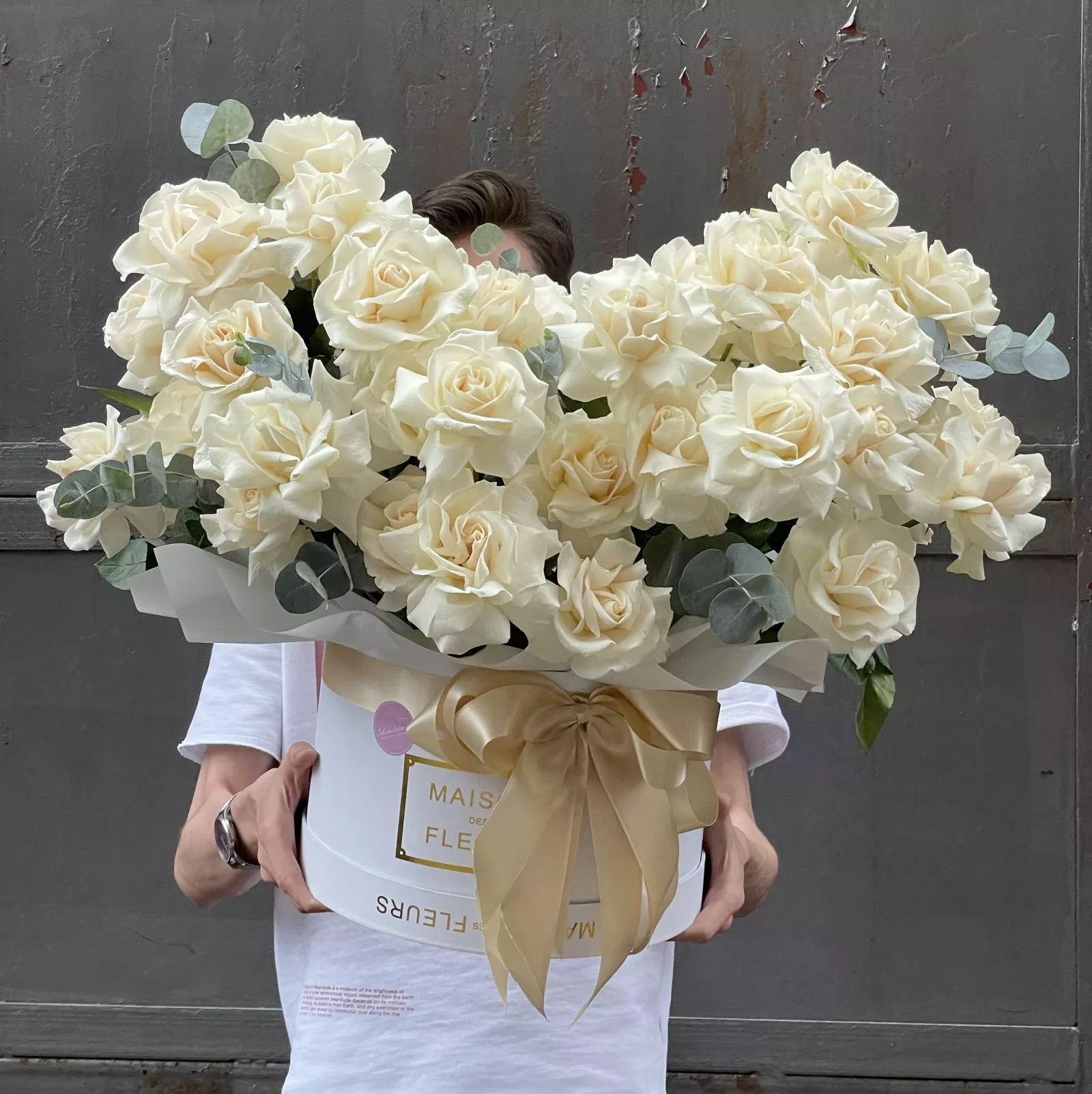 Эвкалипт (Голландия) - 4; Коробка Cтандартная (из комплекта 2в1) - 1; Роза голландская 60 см - 51; Открытка - 1; Шпажка для открытки - 1;