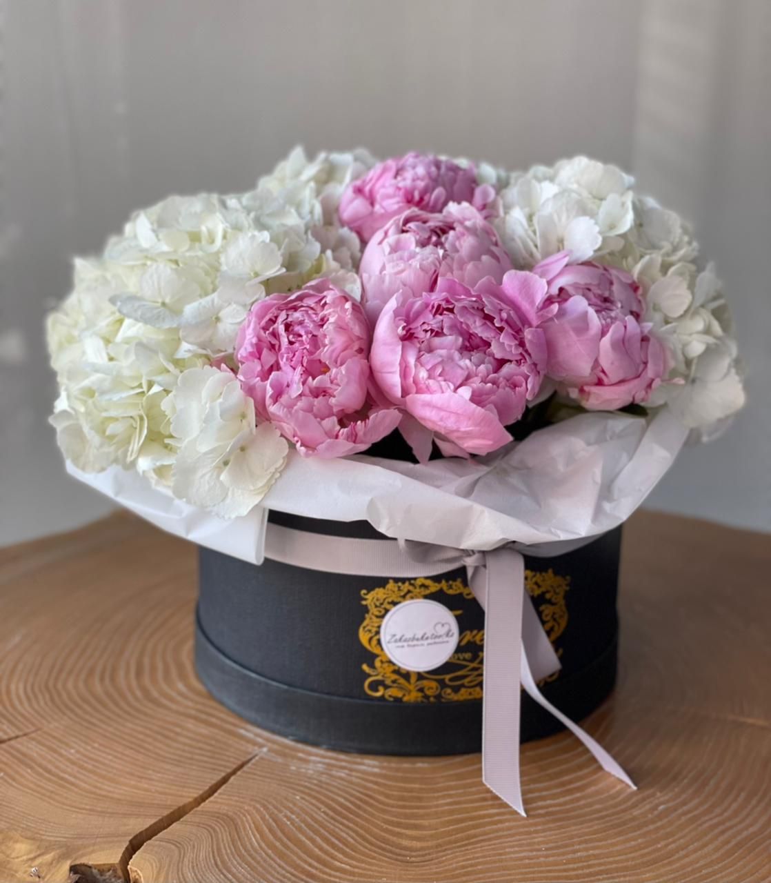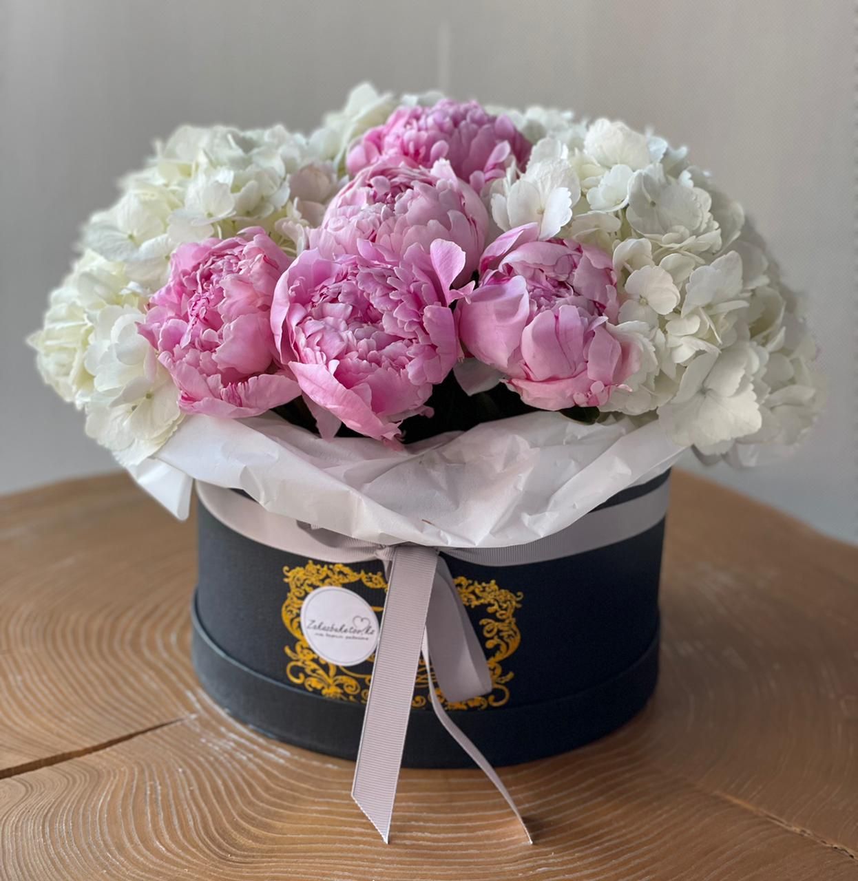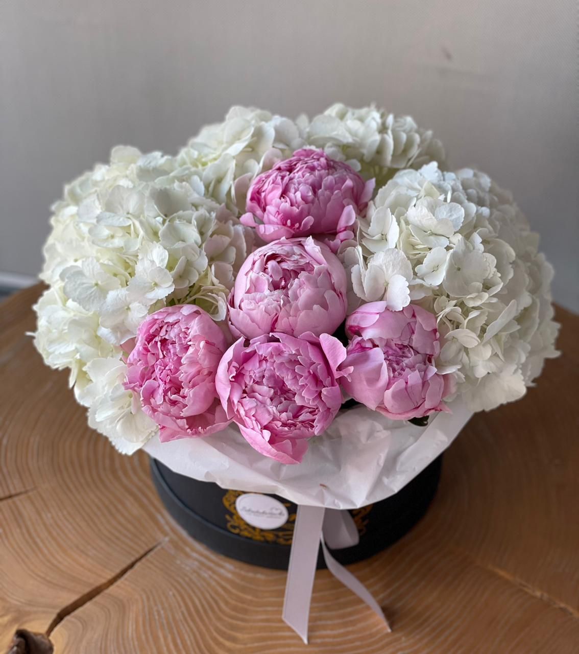 Гортензия (Голландия) - 3; Пион (Голландия) - 5; Коробка Cтандартная (из комплекта 2в1) - 1; Открытка - 1; Шпажка для открытки - 1;