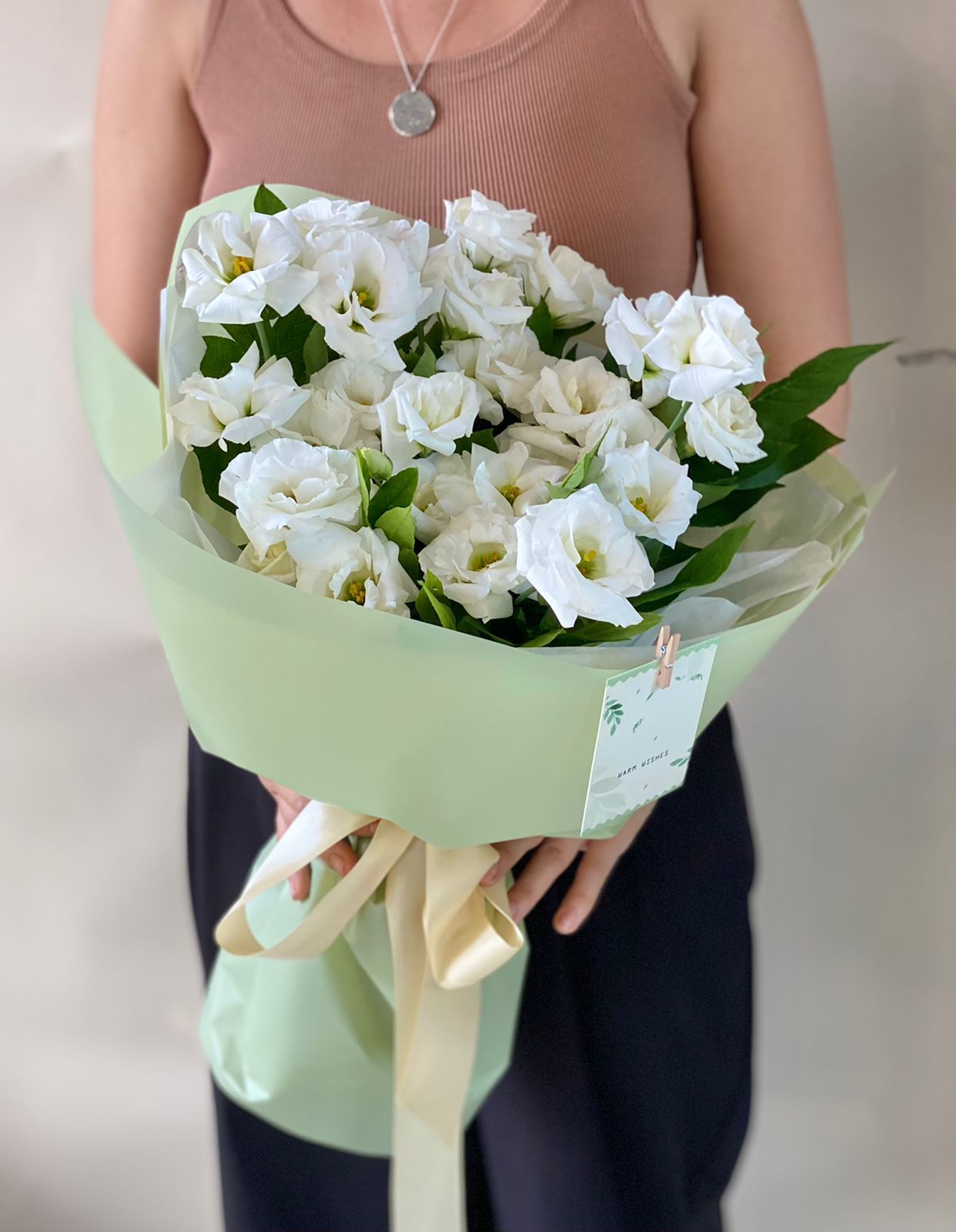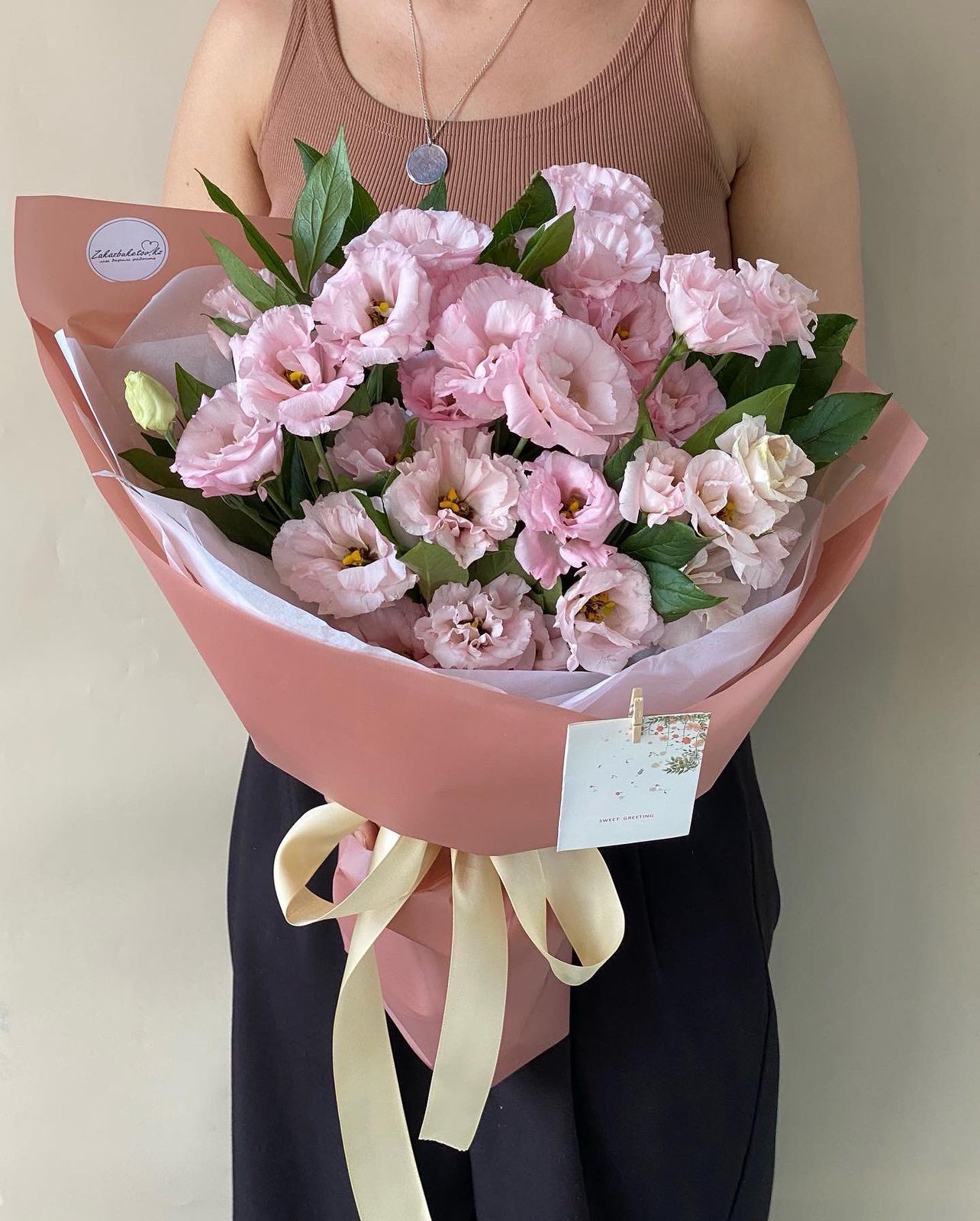 Лизиантус (Израиль) - 10; Зелень местная (средний букет) - 1; Тишью - 4; Калька в ассортименте - 4; Лента для цветов - 1; Шпажка для открытки - 1;