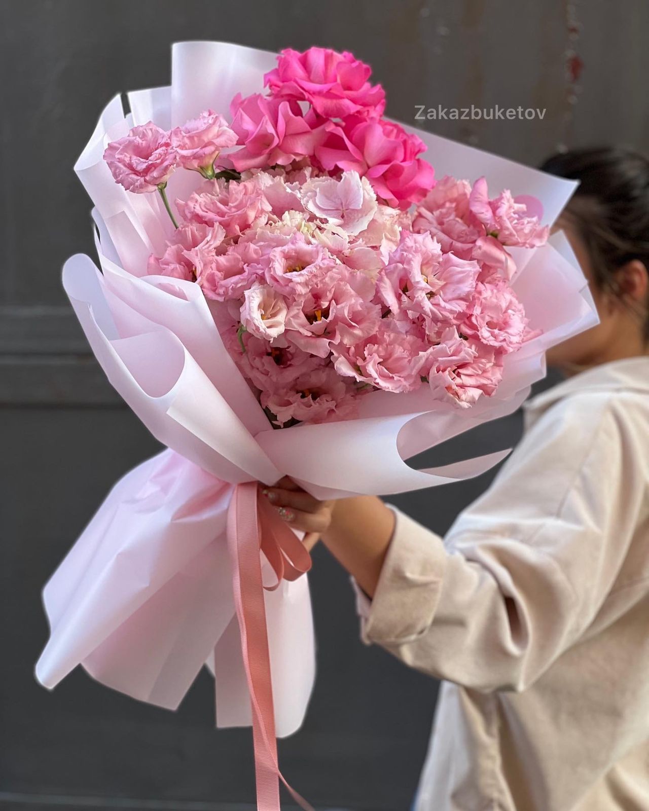Лизиантус (Израиль) - 3; Гортензия (Голландия) - 1; Калька в ассортименте - 4; Роза голландская 60 см - 3; Открытка - 1; Шпажка для открытки - 1;