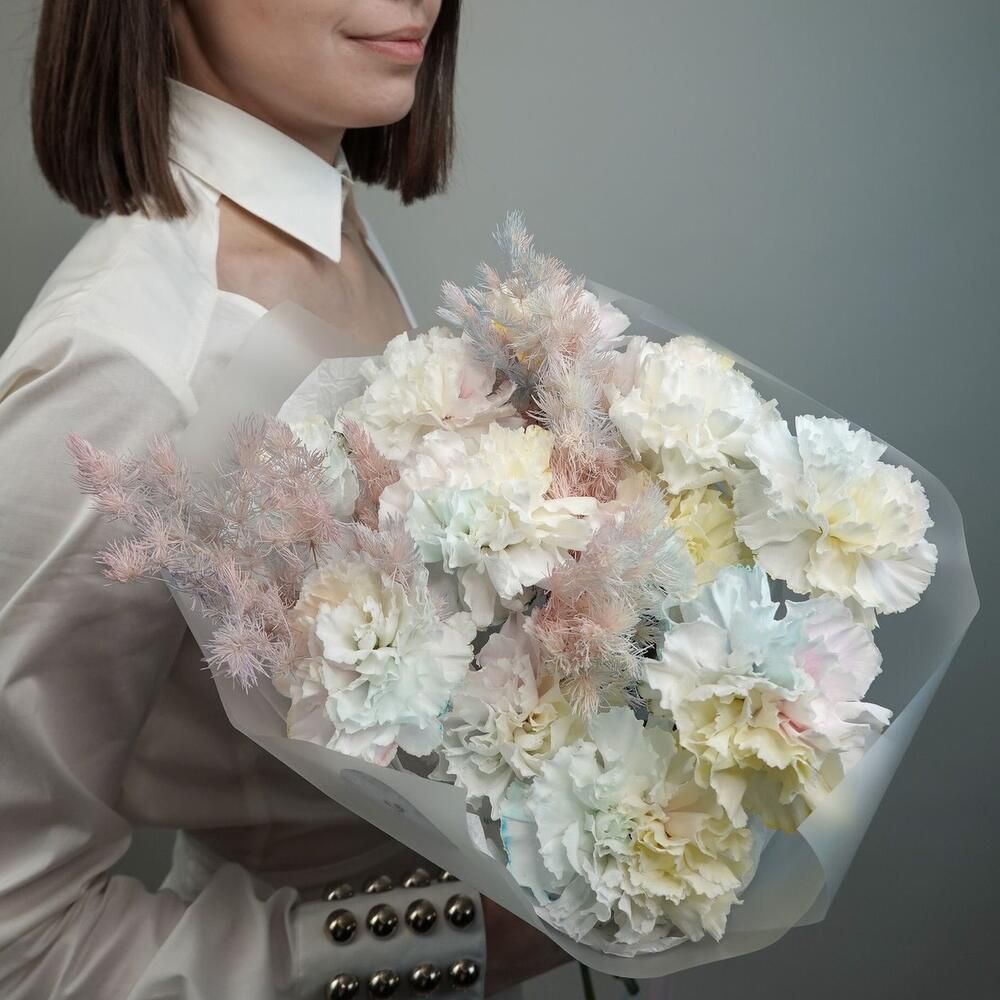 Калька в ассортименте - 6; Лента для цветов - 1; Гвоздика (Голландия) - 11; Аспарагус (Голландия) - 1; Тишью - 1; Открытка - 1; Шпажка для открытки - 1;