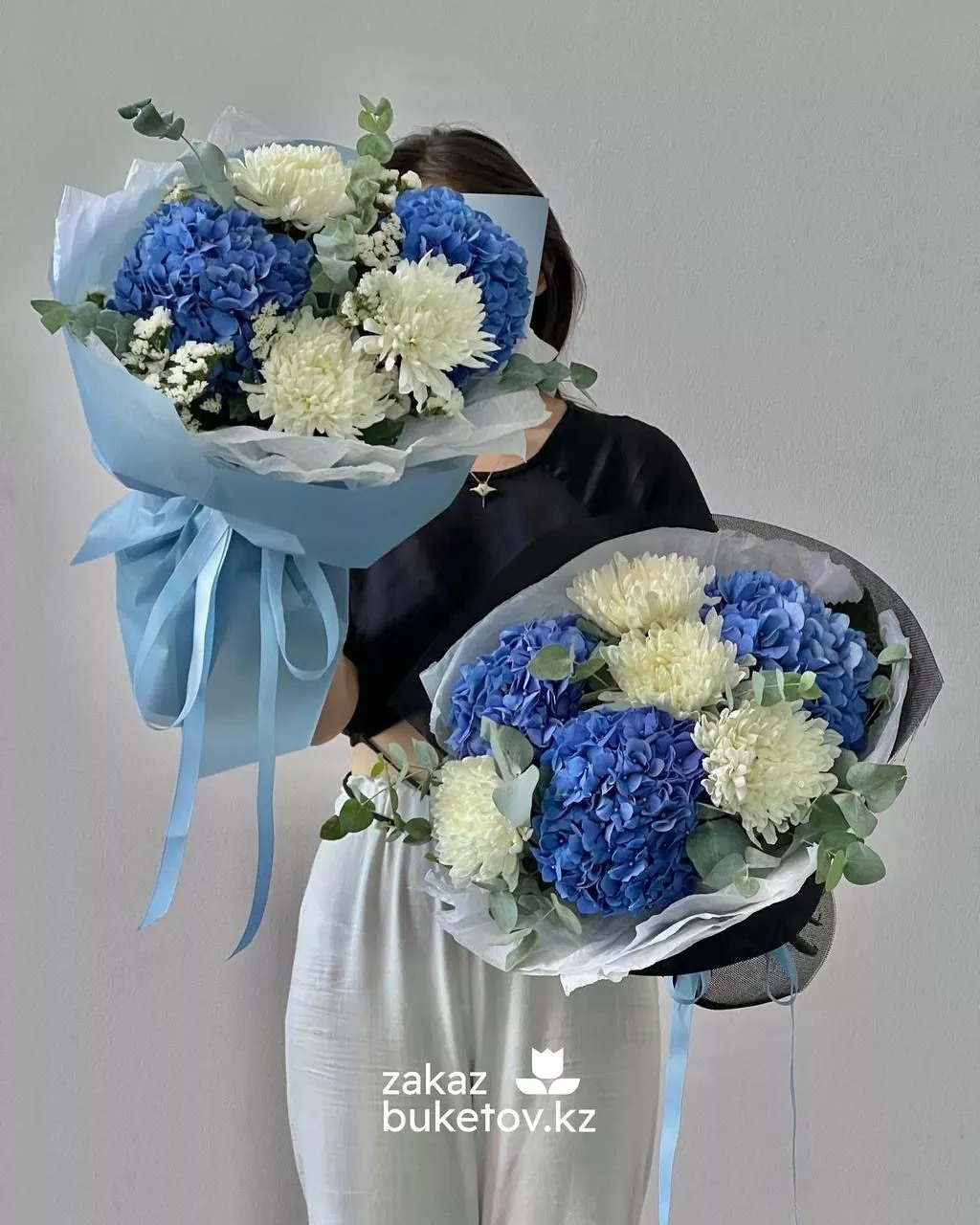 Гортензия (Голландия) - 2; Хризантема одиночка (Голландия) - 3; Статица (Голландия) - 3; Эвкалипт (Голландия) - 2; Тишью - 3; Калька в ассортименте - 4; Открытка - 1; Шпажка для открытки - 1;