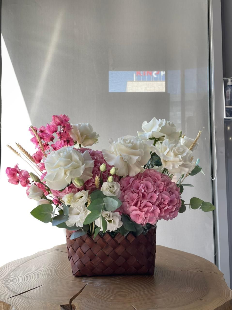 Гортензия (Голландия) - 2; Роза голландская 60 см - 7; Латирус (Голландия) - 2; Эвкалипт (Голландия) - 2; Корзина ручной работы M - 1; Лизиантус (Израиль) - 3; Пшеница (Голландия) - 5; Открытка - 1; Шпажка для открытки - 1;