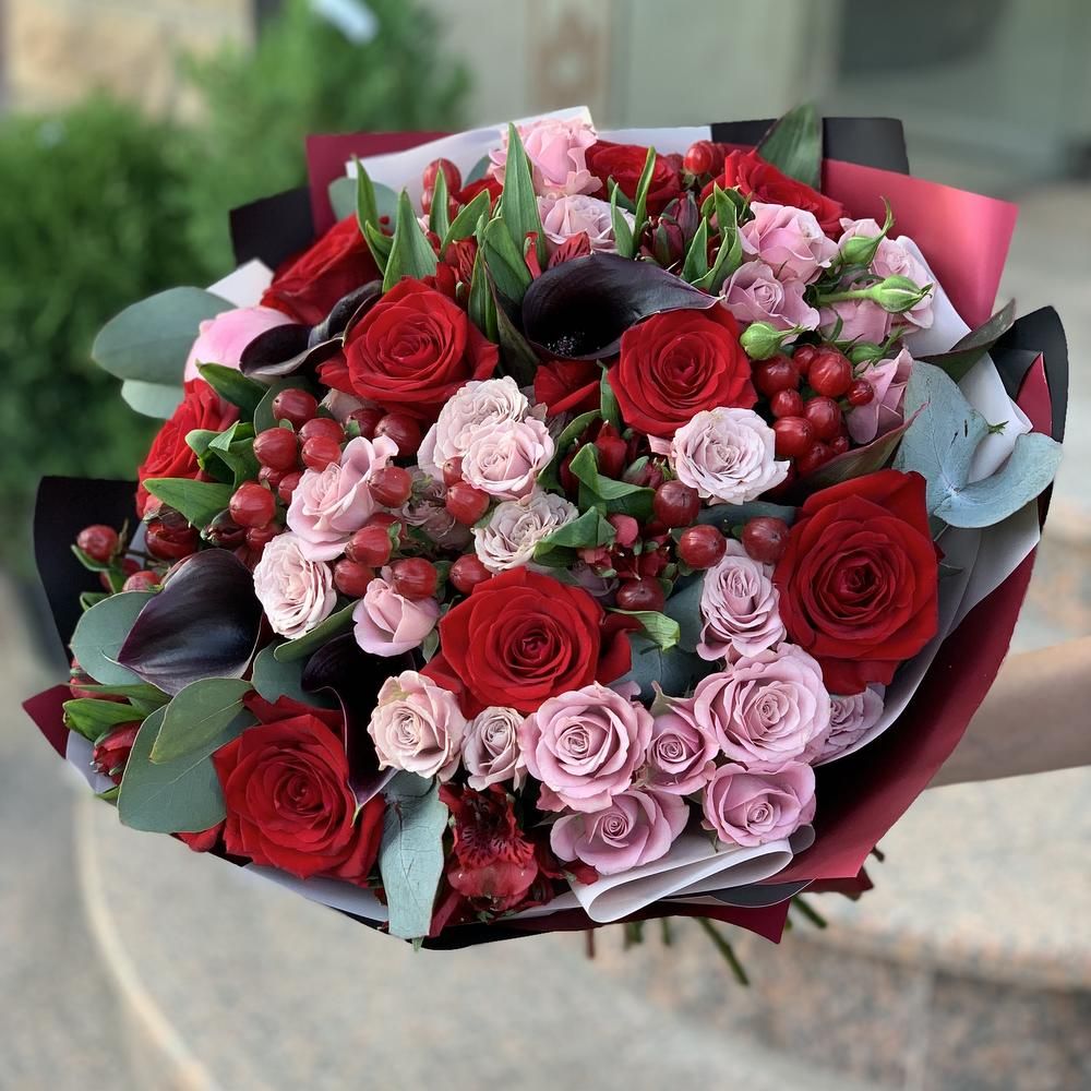 Роза голландская 60 см - 15; Спрей роза (Кения) - 7; Каллы (Голландия) - 8; Альстромерия (Голландия) - 5; Эвкалипт (Голландия) - 7; Калька в ассортименте - 6; Открытка - 1; Шпажка для открытки - 1;