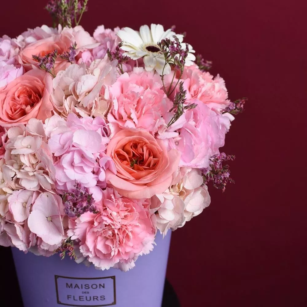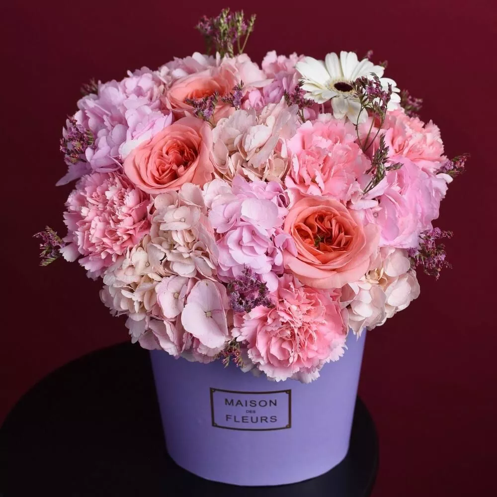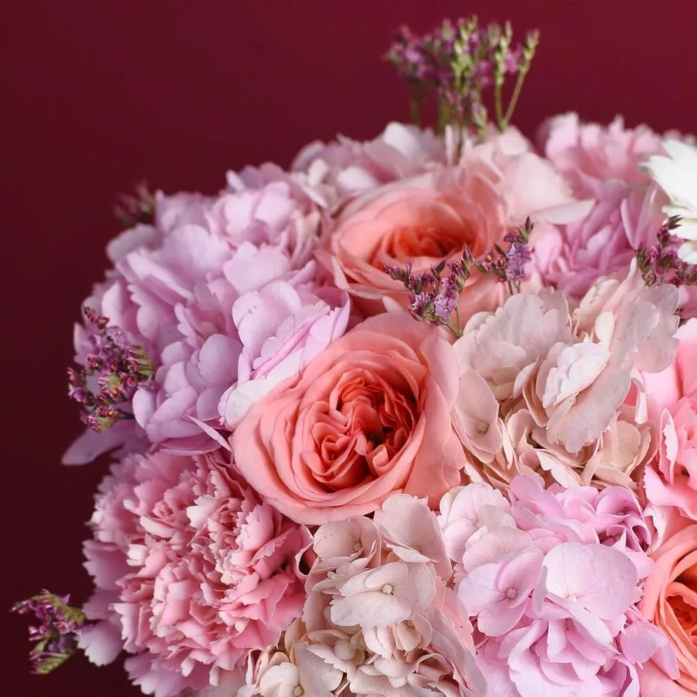 Букет "Малиновый рассвет" из роз, гвоздик и гортензий