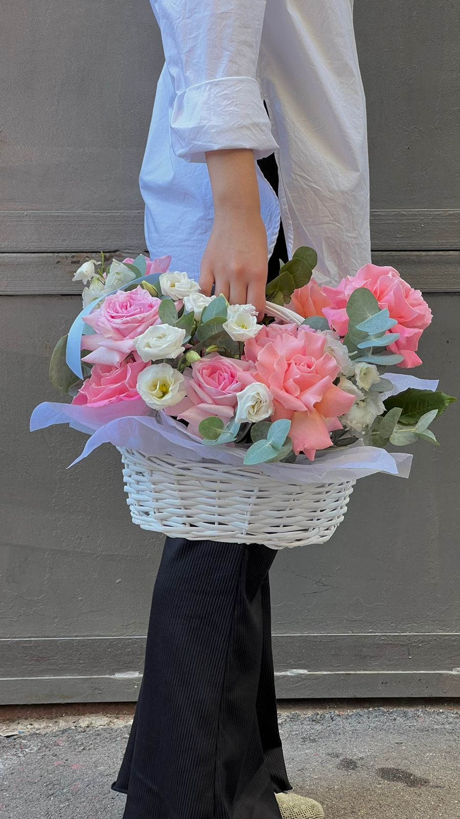 Роза голландская 60 см - 6; Пионовидная роза (Англия) - 3; Лизиантус (Израиль) - 2; Дельфиниум (Голландия) - 1; Эвкалипт (Голландия) - 2; Корзина ручной работы M - 1; Тишью - 3; Калька в ассортименте - 3; Шпажка для открытки - 1;