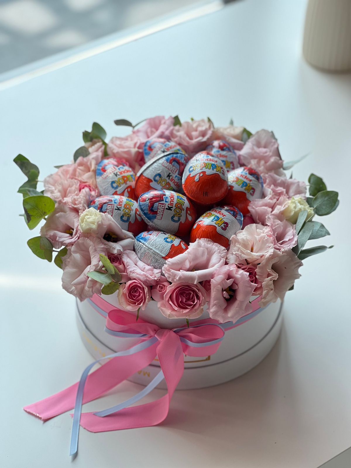 Спрей роза (Кения) - 2; Эвкалипт (Голландия) - 1; Лизиантус (Израиль) - 3; Kinder Сюрприз Яйцо - 10; Коробка Cтандартная (из комплекта 2в1) - 1; Открытка - 1; Шпажка для открытки - 1;