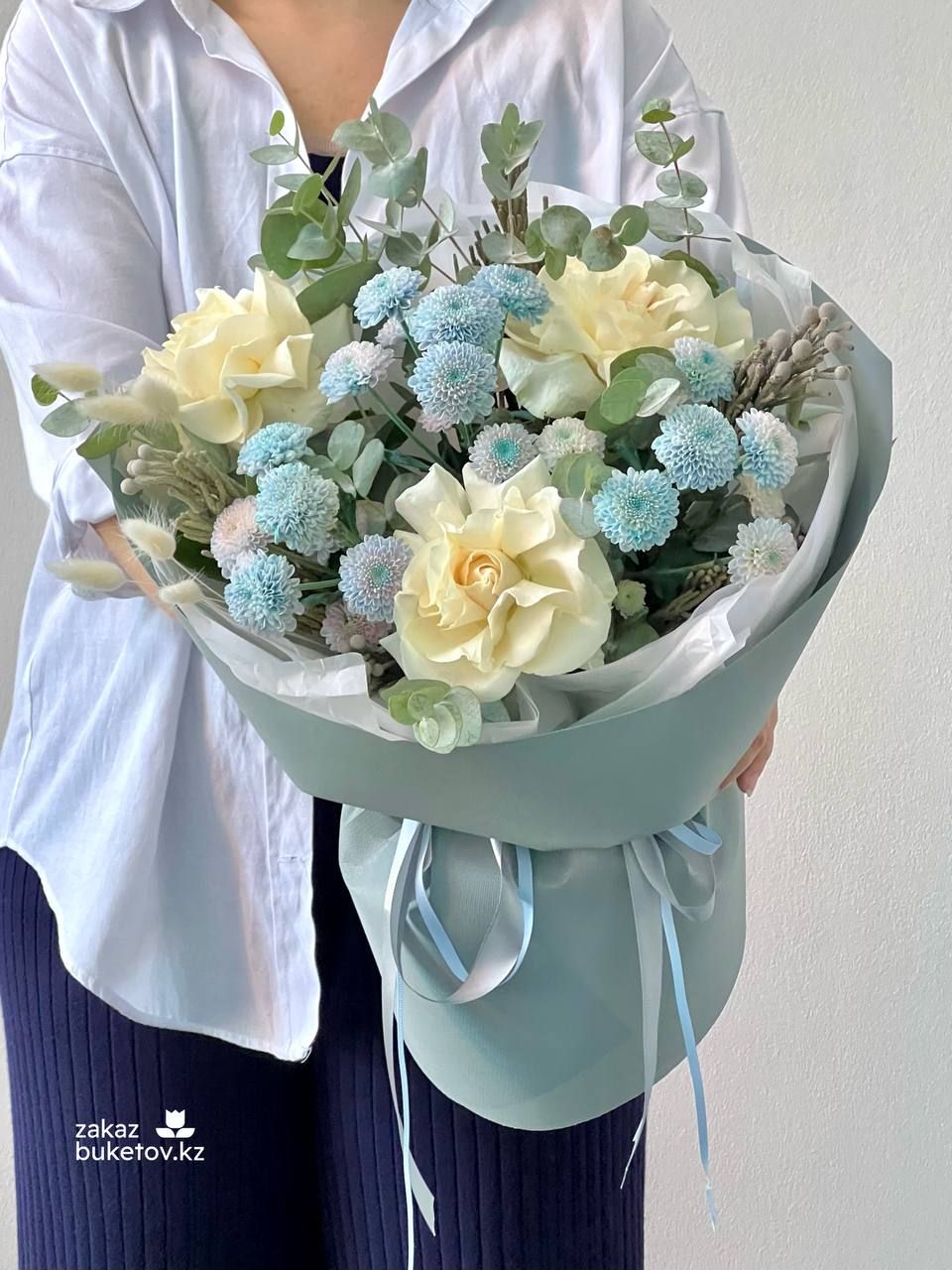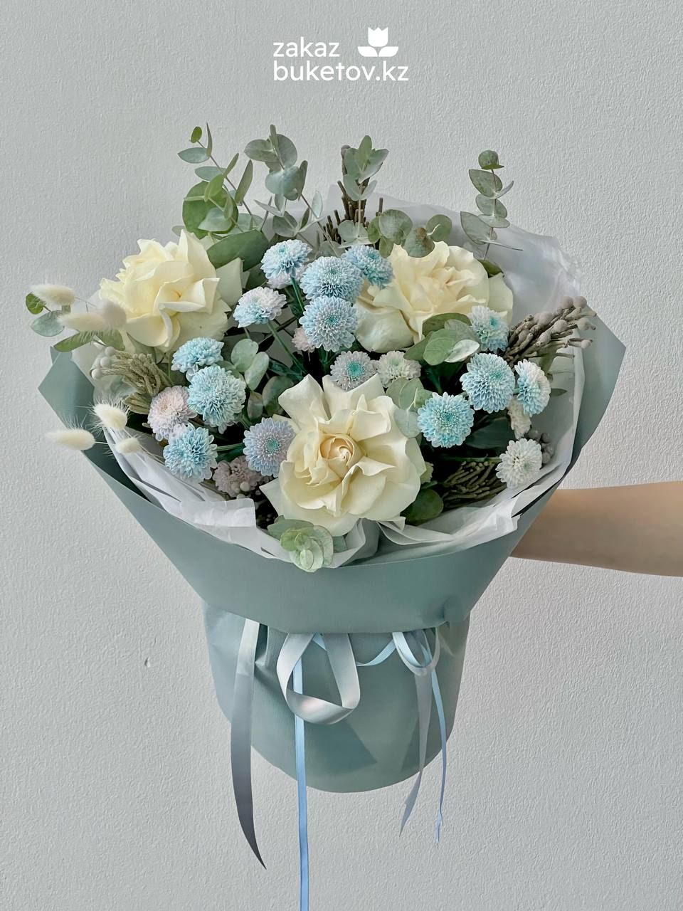 Роза голландская 60 см - 3; Хризантема кустовая крашеная (Голландия) - 3; Бруния (Голландия) - 4; Эвкалипт (Голландия) - 3; Лагурус (Голландия) - 2; Тишью - 3; Фоамиран тонкий - 2; Открытка - 1; Шпажка для открытки - 1;