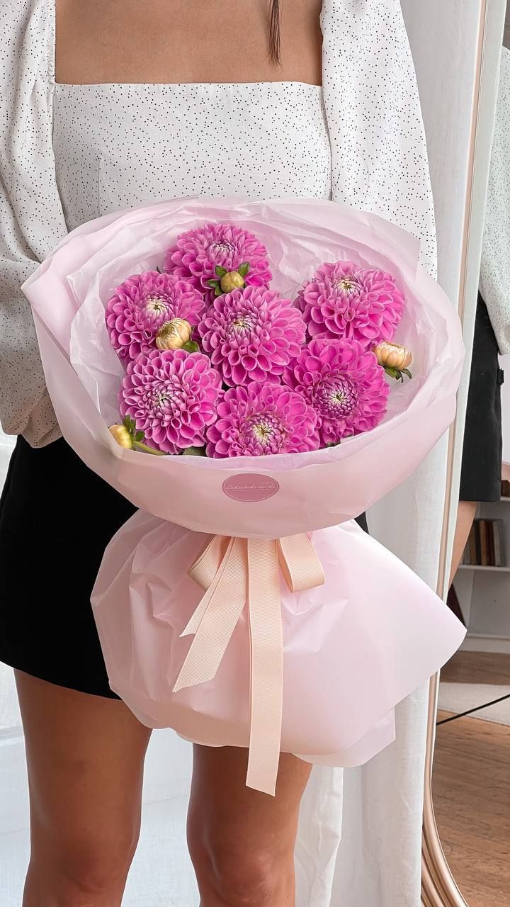Георгин (местный) - 7; Калька в ассортименте - 4; Шпажка для открытки - 1; Открытка - 1;