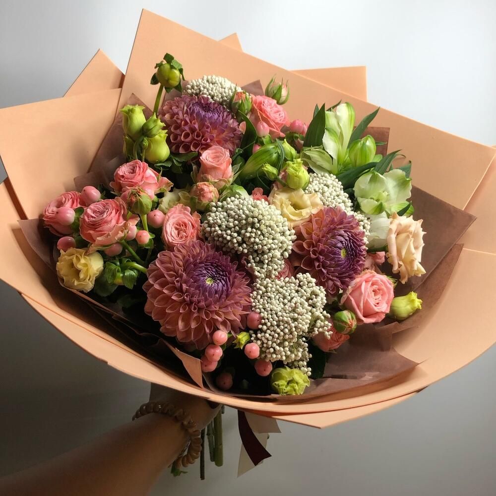 Букет "Клубничный поцелуй" из Лизиантусов, Гипперикума, Георгин и роз