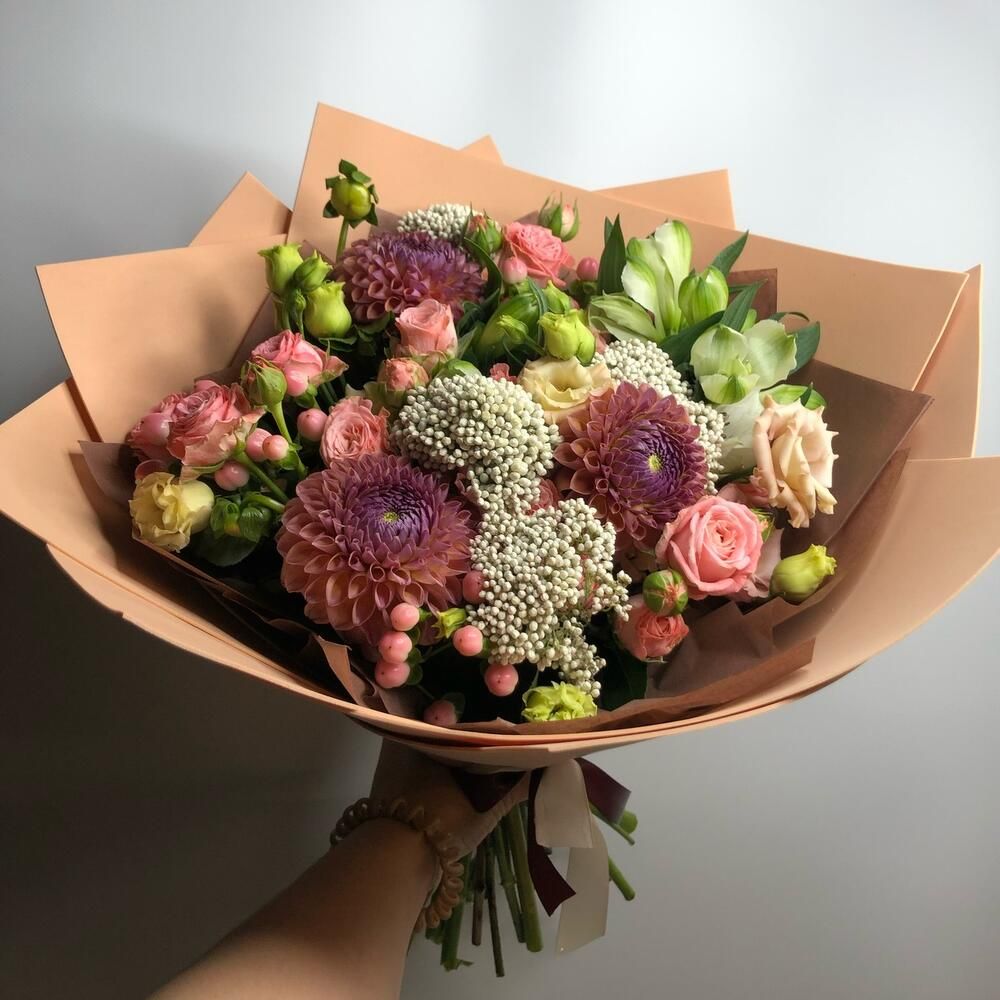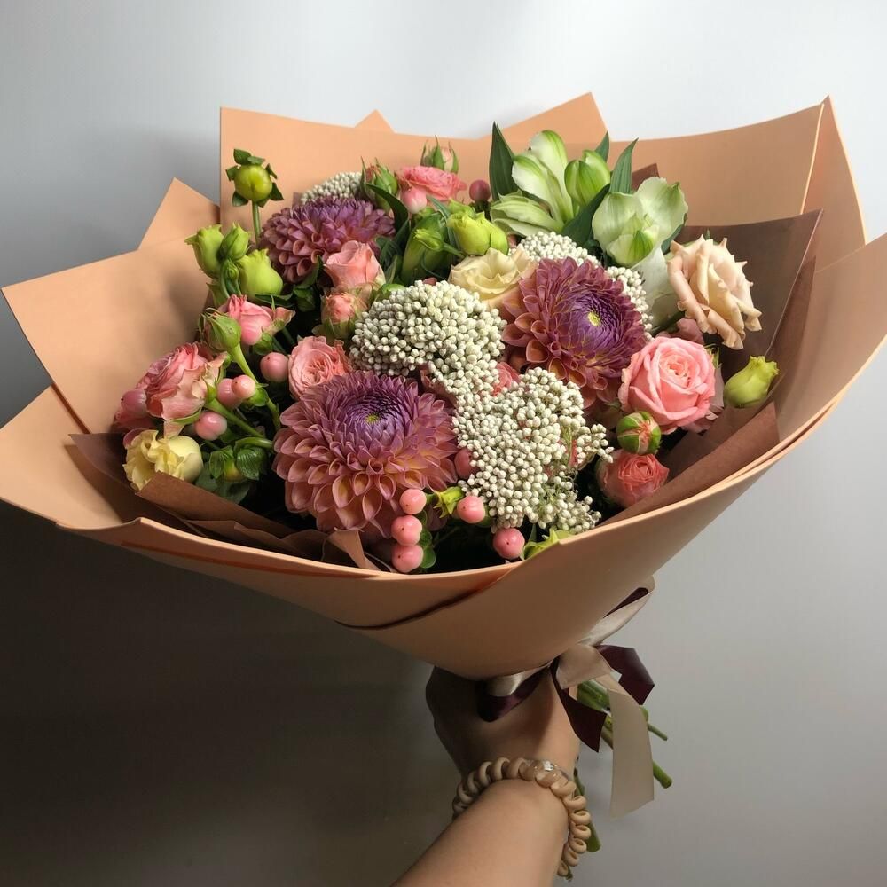 Гипперикум (Голландия) - 2; Альстромерия (Голландия) - 2; Лизиантус (Израиль) - 3; Спрей роза (Кения) - 3; Озотамнус - 4; Калька в ассортименте - 6; Георгин (местный) - 3; Открытка - 1; Шпажка для открытки - 1;