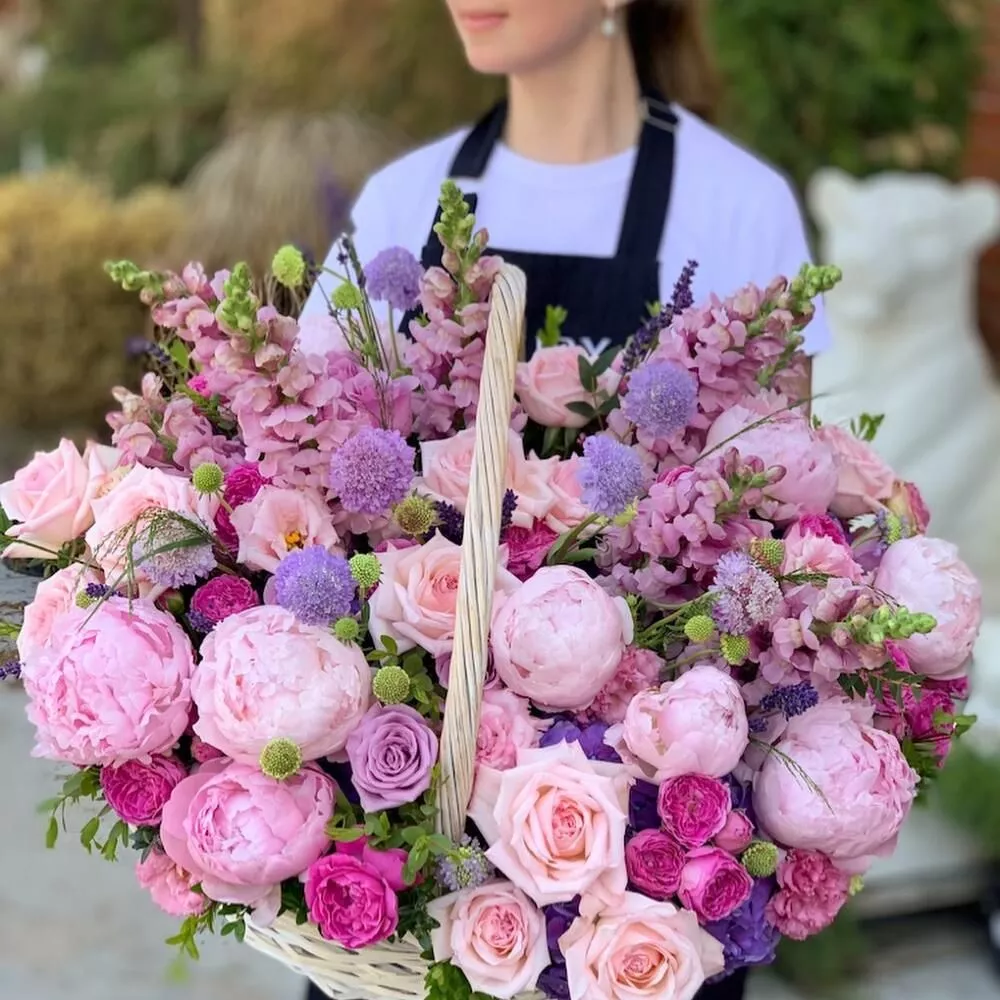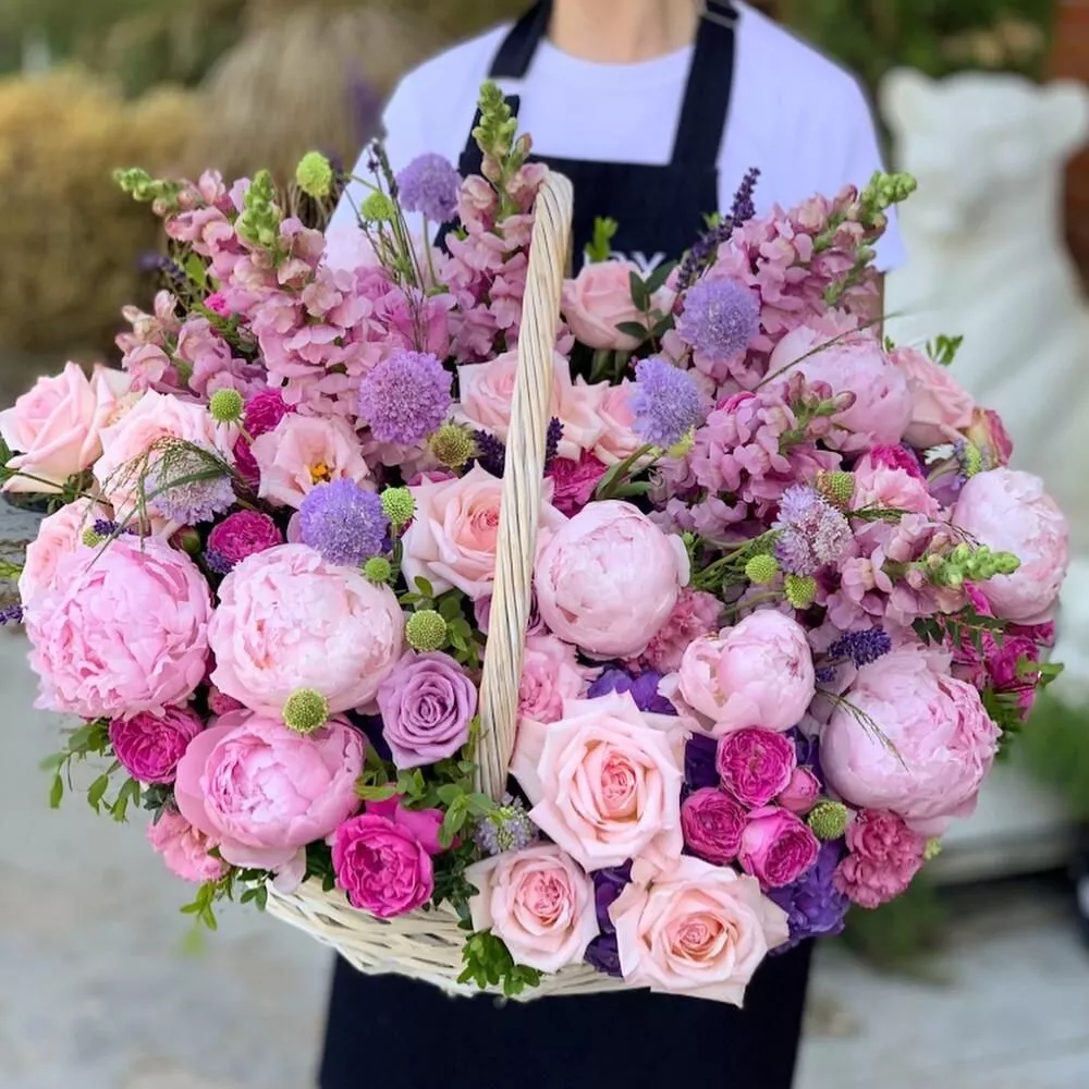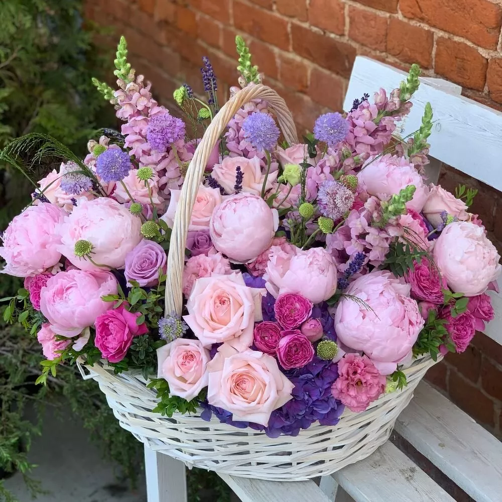Пион (Голландия) - 19; Гортензия (Голландия) - 6; Скабиоза (Голландия) - 10; Пионовидная роза (Англия) - 19; Спрей роза пионовидная (Кения) - 10; Лизиантус (Израиль) - 10; Зелень местная (большой букет) - 3; Роза голландская 60 см - 10; Корзина ручной работы M - 1; Шпажка для открытки - 1;