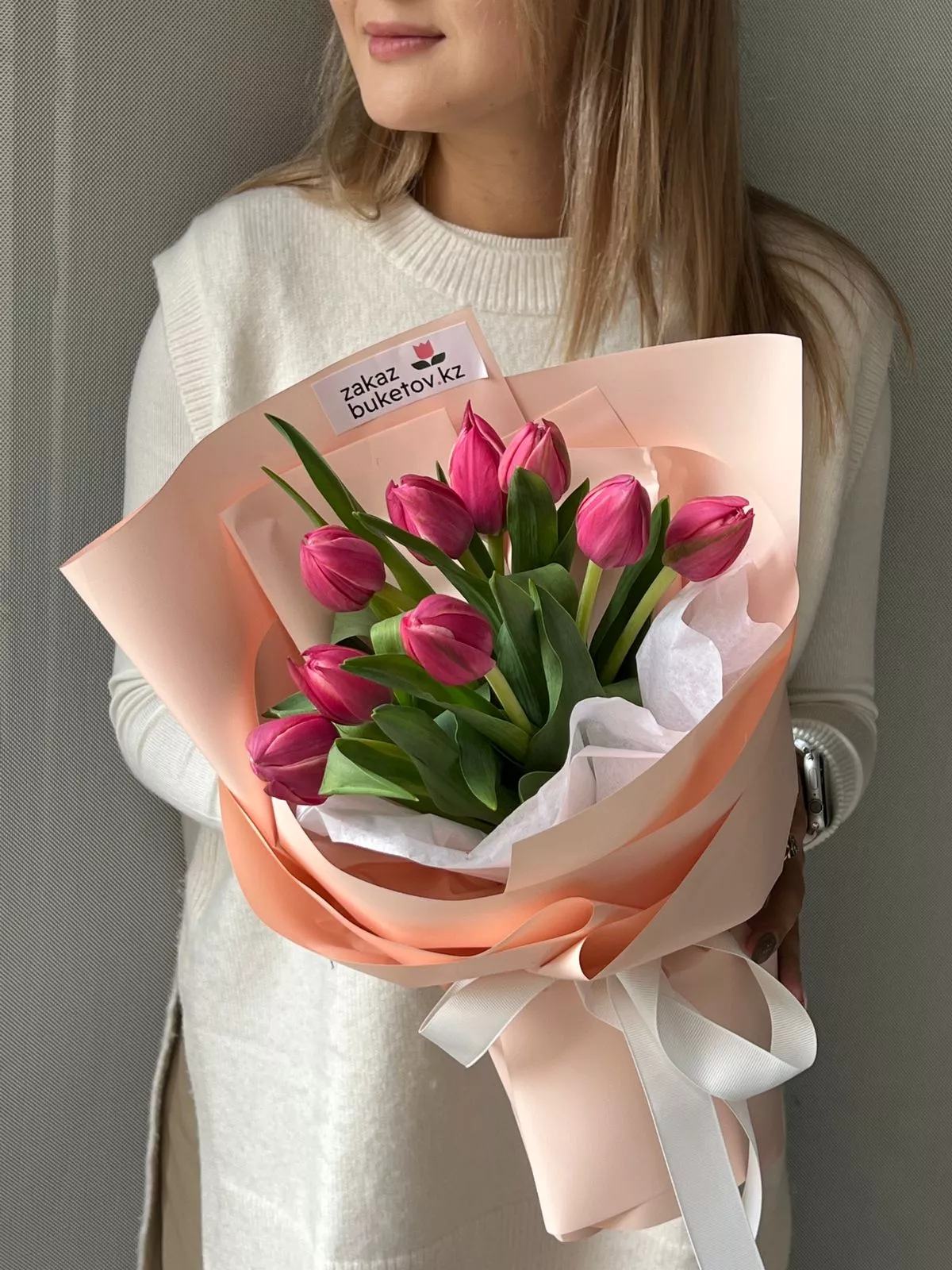 Тюльпан (Голландия) - 9; Тишью - 2; Калька в ассортименте - 3; Открытка - 1; Шпажка для открытки - 1;