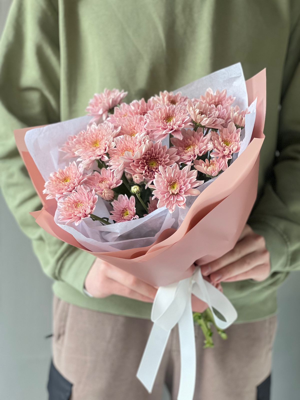 Хризантема кустовая (Голландия) - 5; Тишью - 2; Калька в ассортименте - 2; Открытка - 1; Шпажка для открытки - 1;