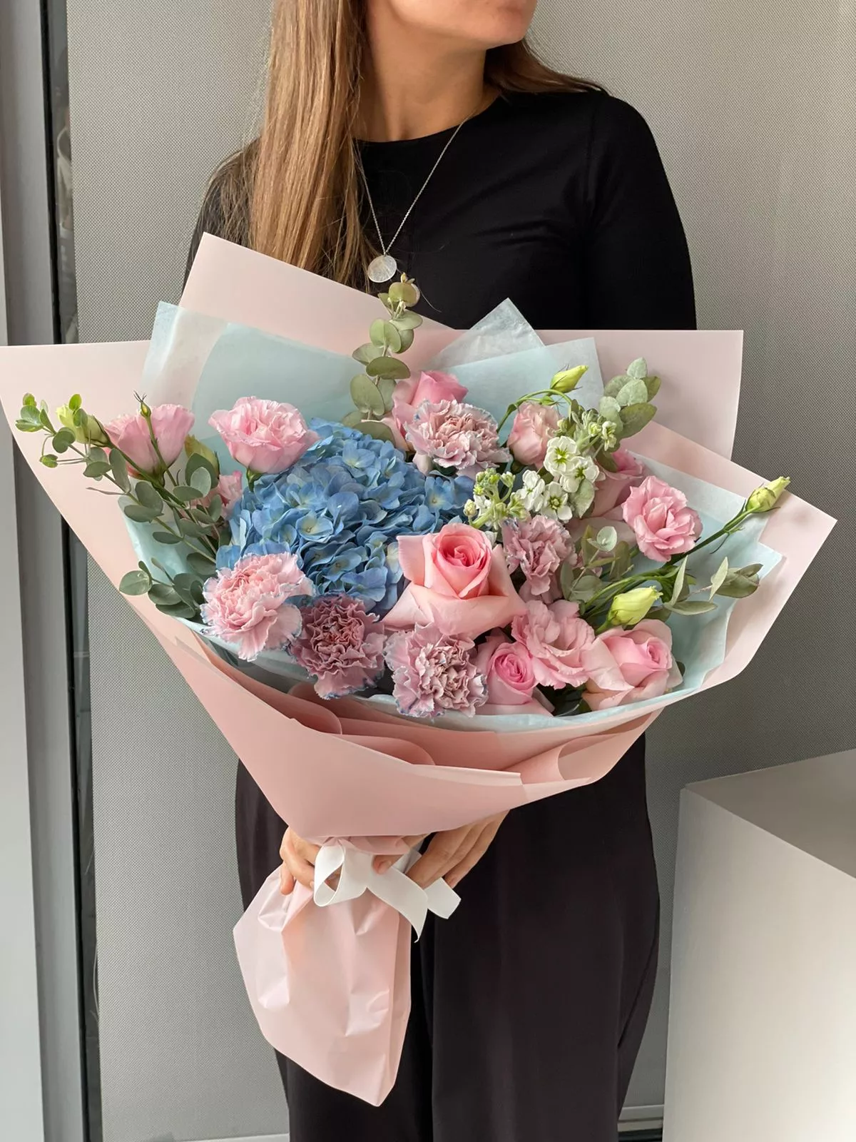 Букет «Безмятежность» из гортензии, гвоздик, роз и лизиантусов