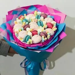 Калька в ассортименте - 5; Маршмеллоу в ассортименте 100 гр - 2; Зефир в ассортименте 100гр - 8; Печенье Макаронс - 10; Открытка - 1; Шпажка для открытки - 1;