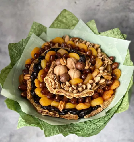 Букет с миндалем «Каскад» — букет из самых популярных сухофруктов и орехов в оригинальной композиции в подарок на праздник или в знак внимания от Zakazbuketov.kz