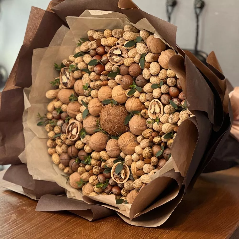 Букет из орехов" Ореховый бум" — вкусный букет в подарок для любимых и близких людей. Полезный подарок на день рождения, юбилей или в знак внимания от Zakazbuketov.kz