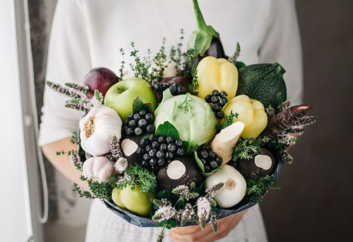 Овощи в ассортименте 500 гр - 5; Зелень местная (большой букет) - 1; Калька в ассортименте - 6; Открытка - 1;