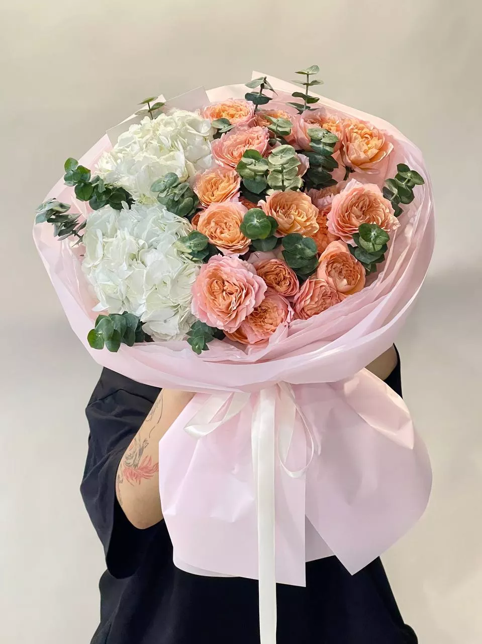 Чудеснейший букет из колумбийской гортензии, эвкалипта и пионовидной спрей розы. Если Вы хотите подарить незабываемые эмоции дорогому человеку — закажите доставку цветов в Zakazbuketovkz