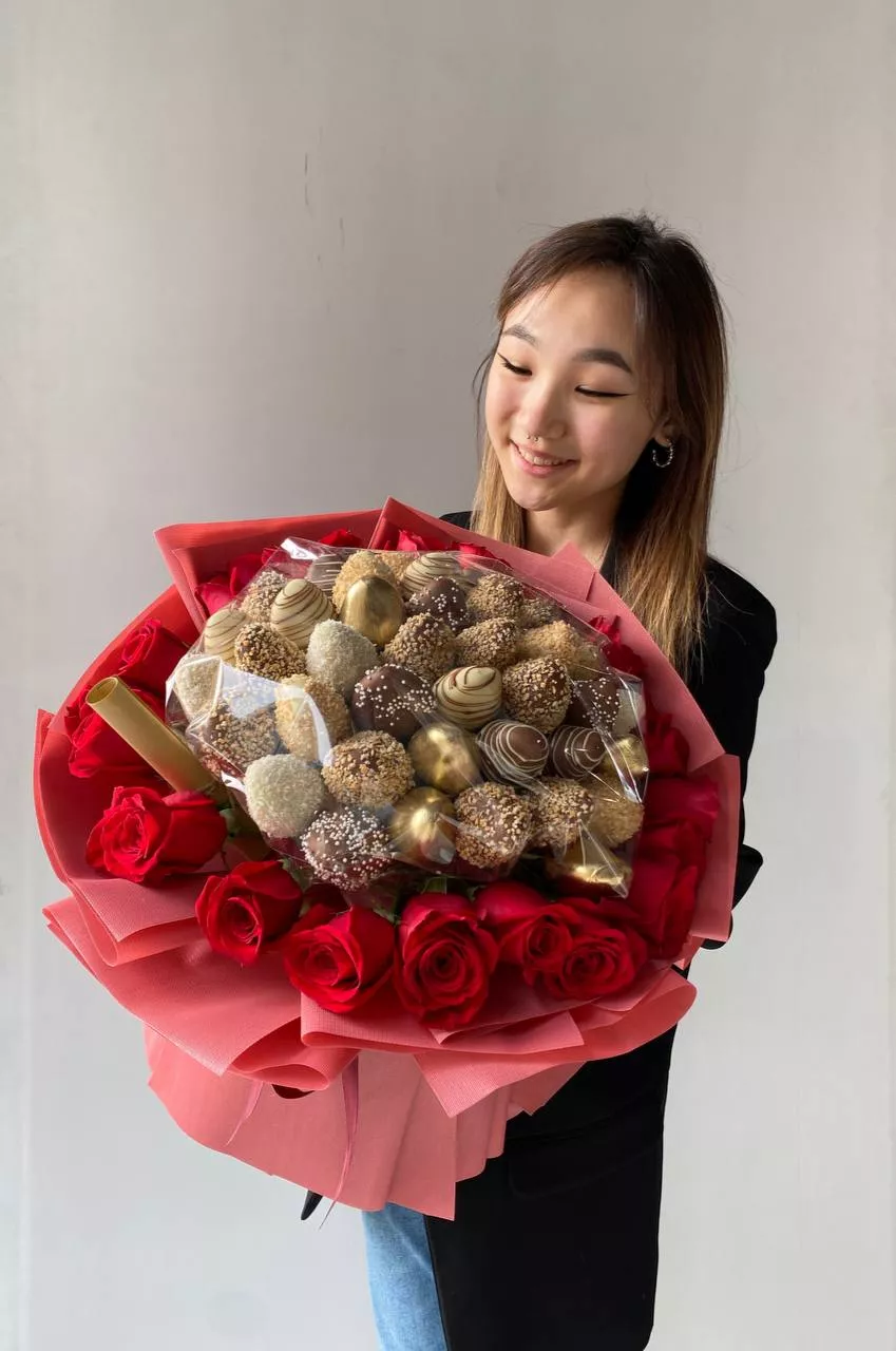 Шикарная композиция с голландскими розами и клубникой в шоколаде! Если Вы хотите подарить незабываемые эмоции дорогому человеку — закажите доставку цветов в Zakazbuketovkz