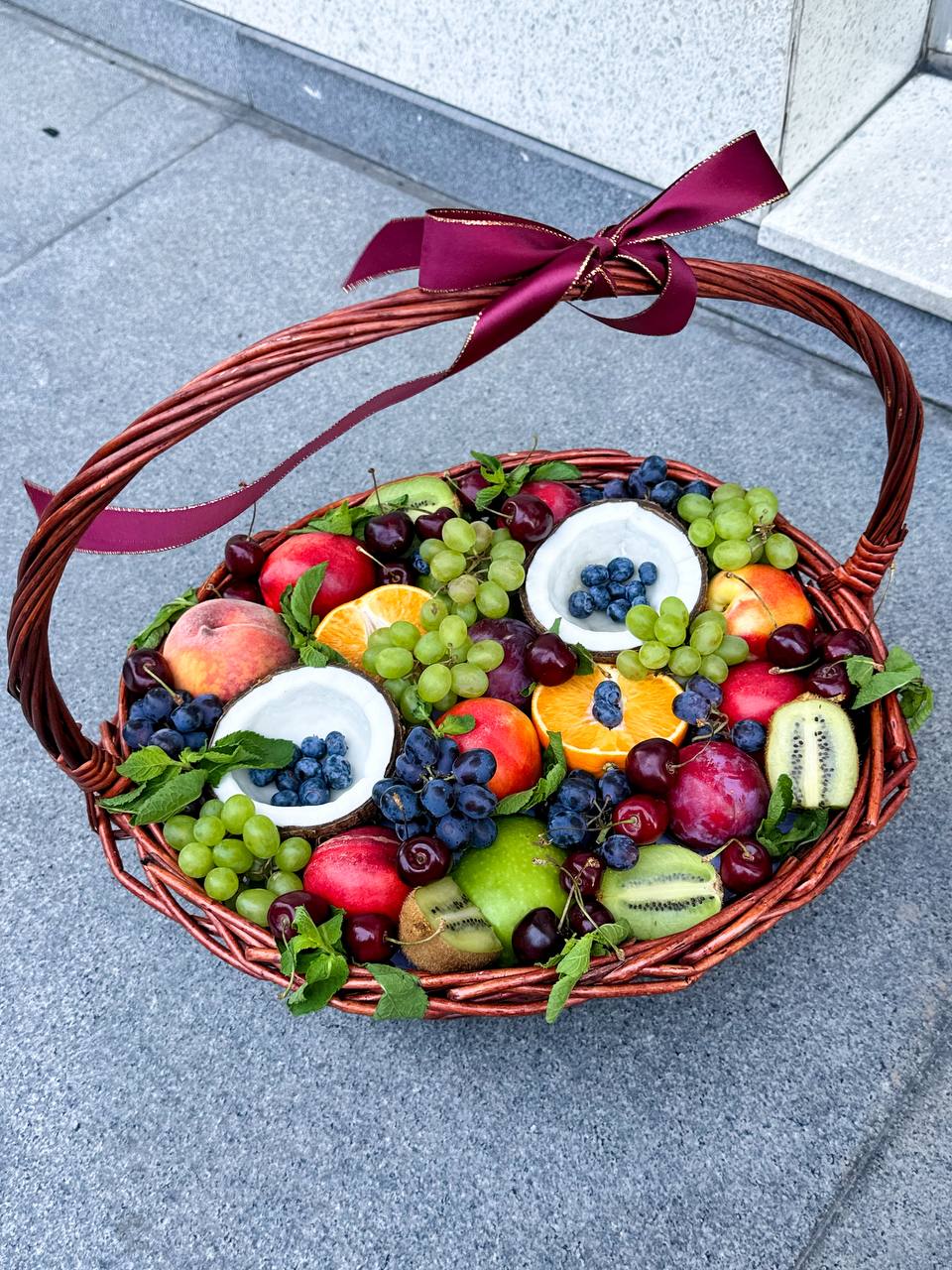 Корзина "Баунти" с виноградом, черешней, кокосом и экзотическими фруктами. Если Вы хотите подарить незабываемые эмоции дорогому человеку — оформите доставку подарков в Zakazbuketovkz