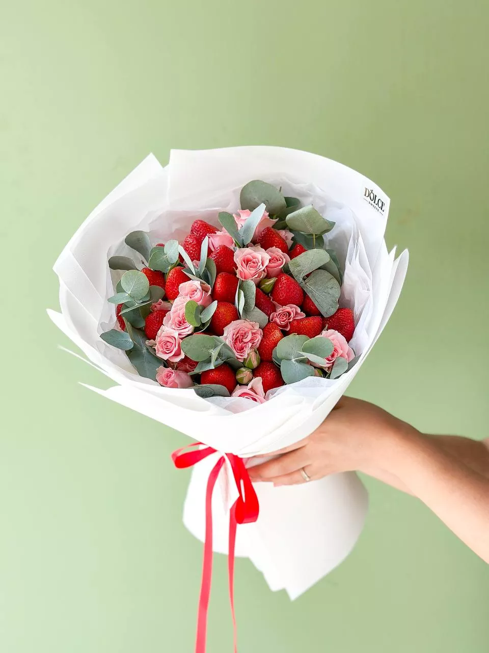Клубничный букет "Свежесть" M из свежей клубнички и спрей роз
