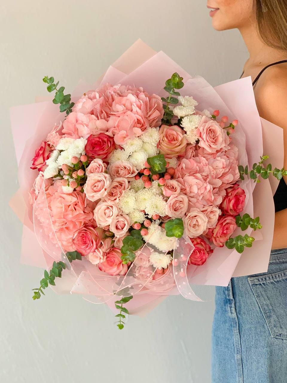 Букет "Ноты души" с розой, гортензией и хризантемой в оформлении. Для цветов повод не нужен. Круглосуточно доставляем букеты, которые вызывают восторг и улыбку.