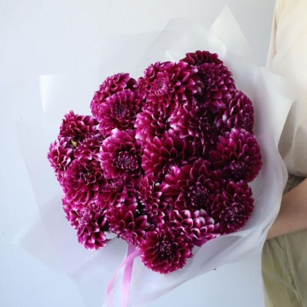 Моно букет из 29 георгинов в оформлении. Если Вы хотите подарить незабываемые эмоции дорогому человеку — закажите доставку цветов в Zakazbuketovkz