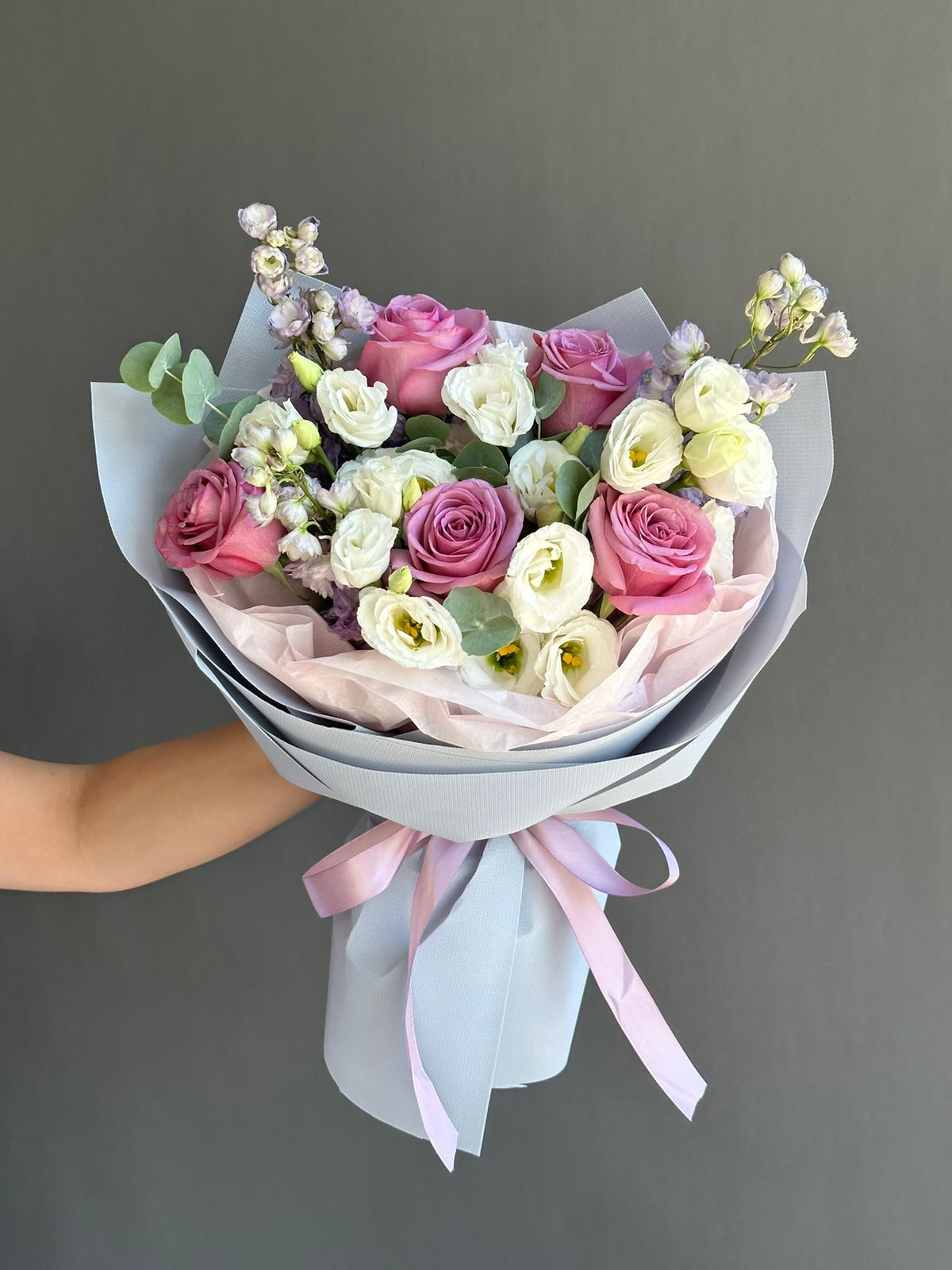 Композиция "Иммерсив" с дельфиниумом, розами и лизиантусом в оформлении. Если Вы хотите подарить незабываемые эмоции дорогому человеку — закажите доставку цветов в Zakazbuketovkz