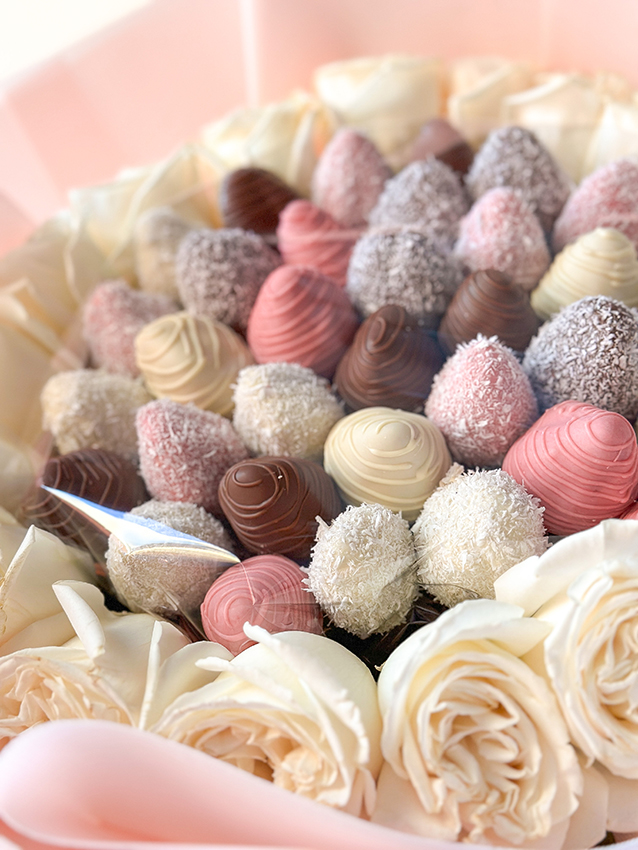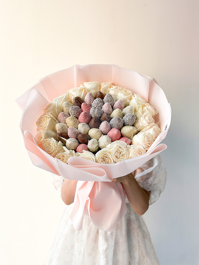 Букет из клубники в молочном и белом шоколаде, украшенной кокосовой стружкой и кондитерской посыпкой, с белыми розами.