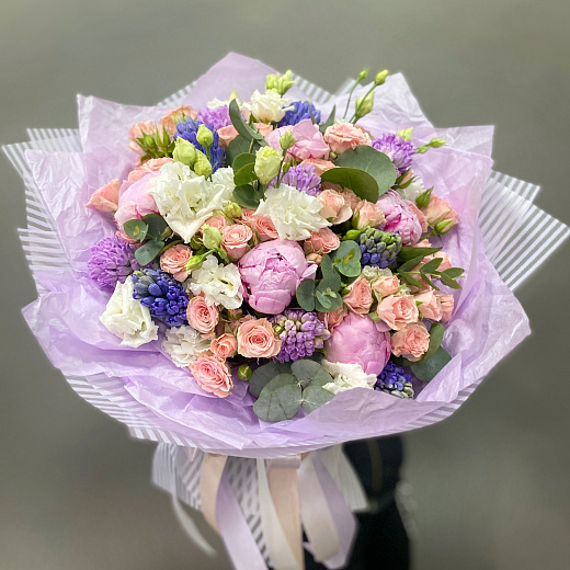 Композиция "Принцесса Фелисити" из спрей роз, пионов, гиацинтов и лизиантусов