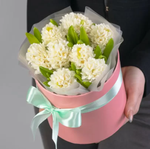 Композиция из 7 белых гиацинтов в коробке. Если Вы хотите подарить незабываемые эмоции дорогому человеку — закажите доставку цветов в Zakazbuketovkz