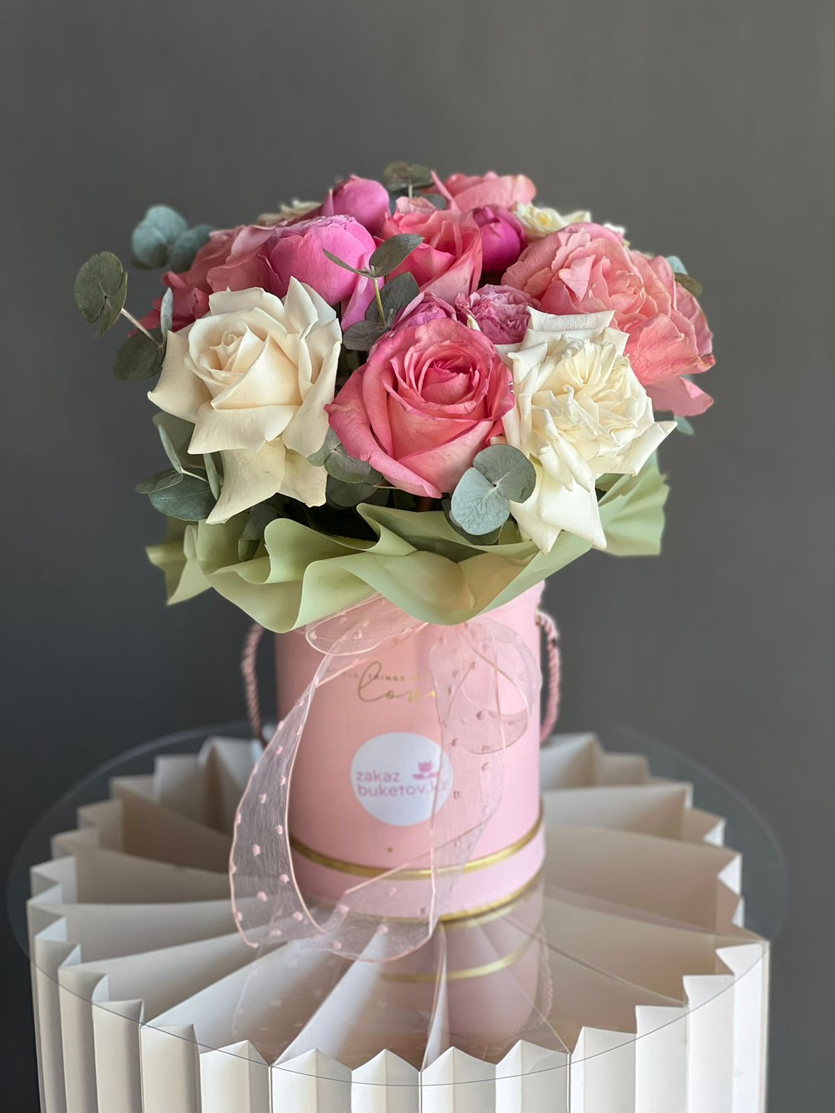 Композиция "Rosemary" из роз и эвкалипта в коробке. Если Вы хотите подарить незабываемые эмоции дорогому человеку — закажите доставку цветов в Zakazbuketovkz
