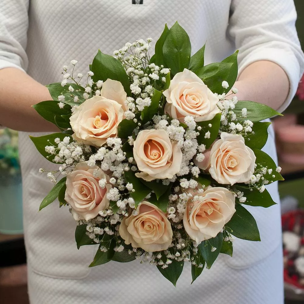 Гипсофила (Голландия) - 3; Роза голландская 60 см - 7; Свадебное оформление букета - 1; Салал (Голландия) - 7;