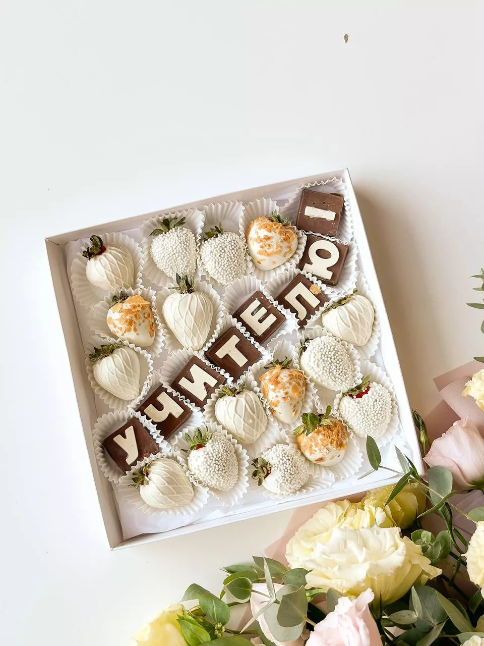 Сочная клубника в итальянском шоколаде с шоколадными буквами. К заказу доступны варианты в белом и молочном шоколаде. Порадуй своего любимого учителя.