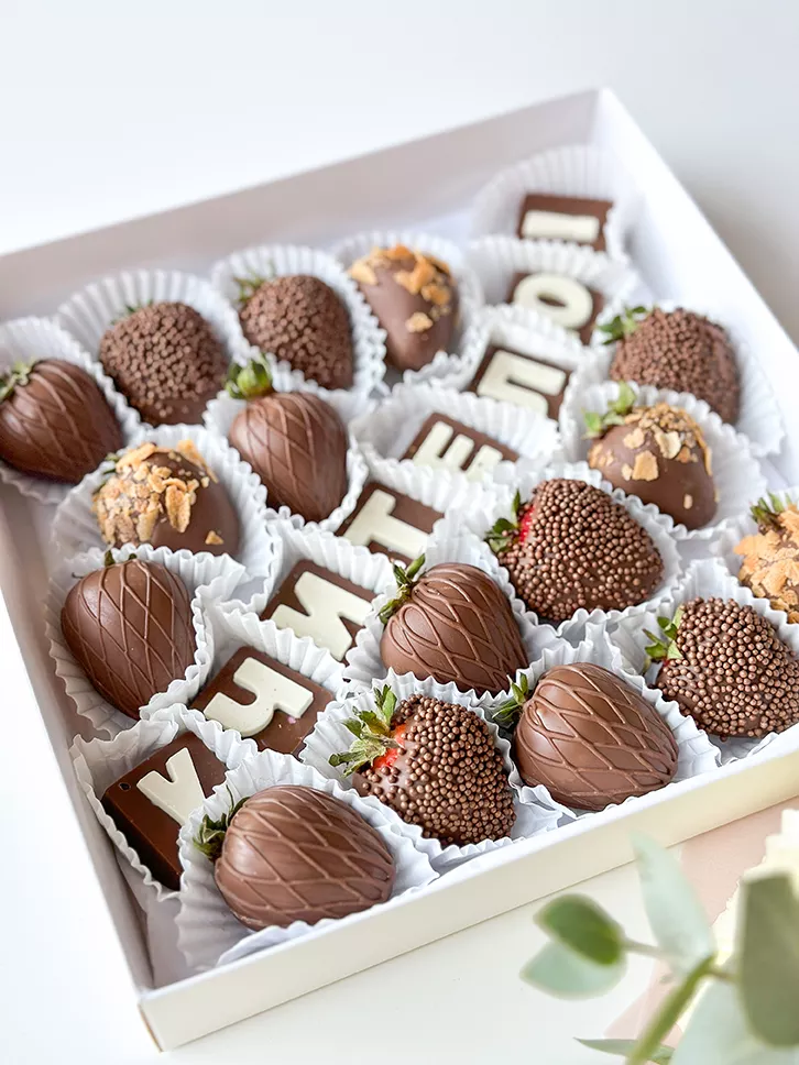 Клубника в шоколаде - 16; Коробочка для клубники - 1; Шоколадные буквы - 8;