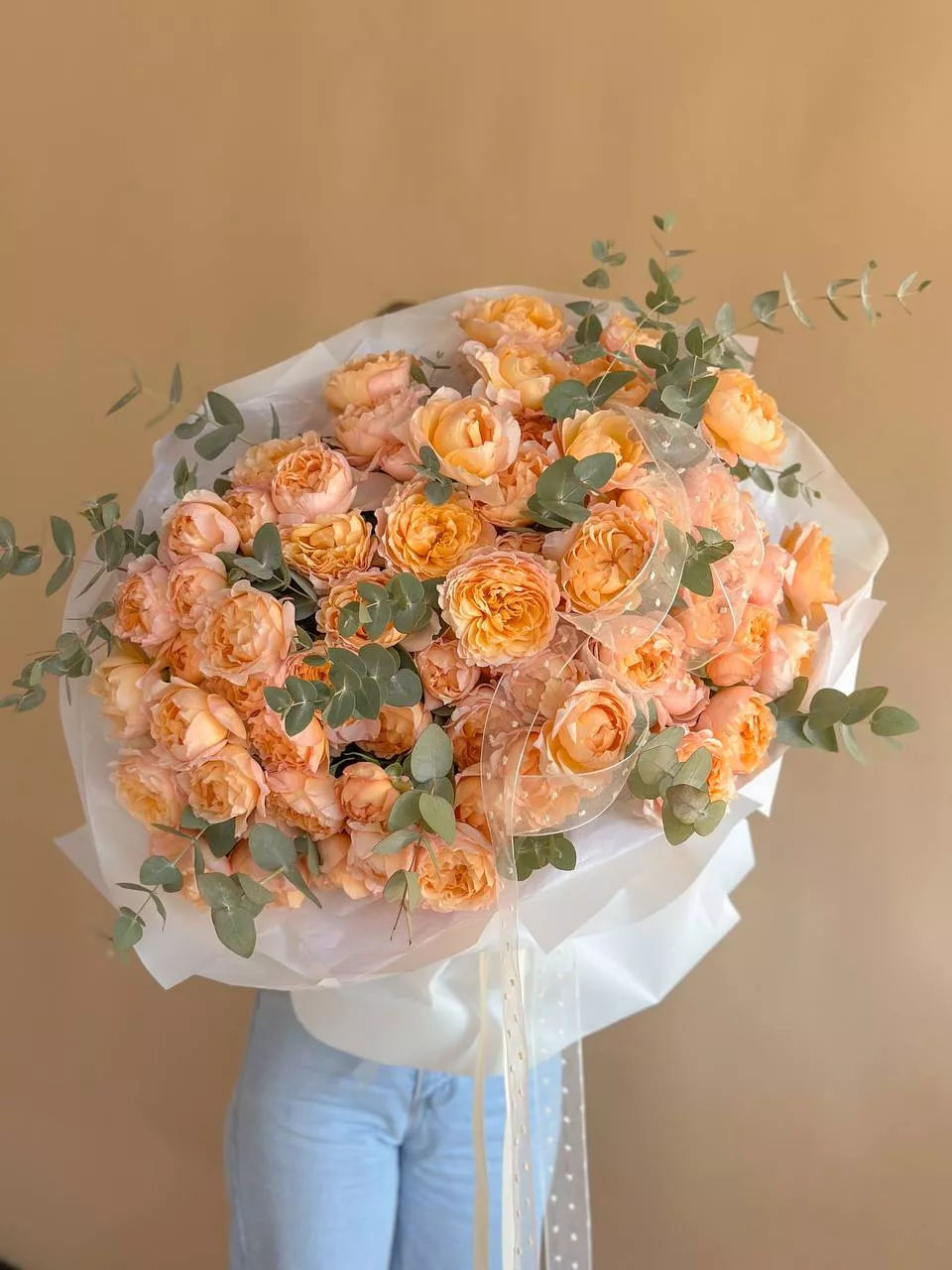 Шикарный букет из пионовидных спрей роз с эвкалиптом в стильном оформлении. Если Вы хотите подарить незабываемые эмоции дорогому человеку — закажите доставку цветов в Zakazbuketovkz