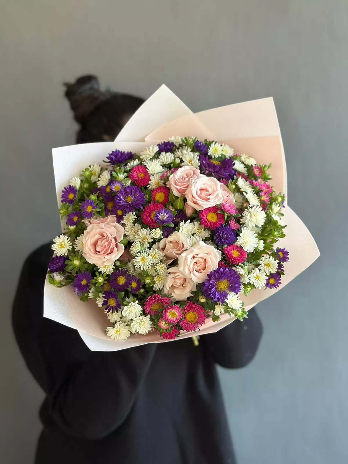 Букет "Астрид" из астр и роз в оформлении. Если Вы хотите подарить незабываемые эмоции дорогому человеку — закажите доставку цветов в Zakazbuketovkz