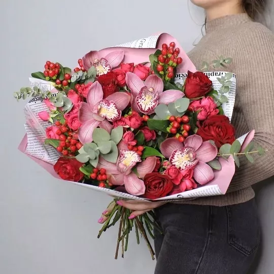 Сборный букет из орхидей, роз, гиперикума и эвкалипта в стильном оформлении. Если Вы хотите подарить незабываемые эмоции дорогому человеку — закажите доставку цветов в Zakazbuketovkz