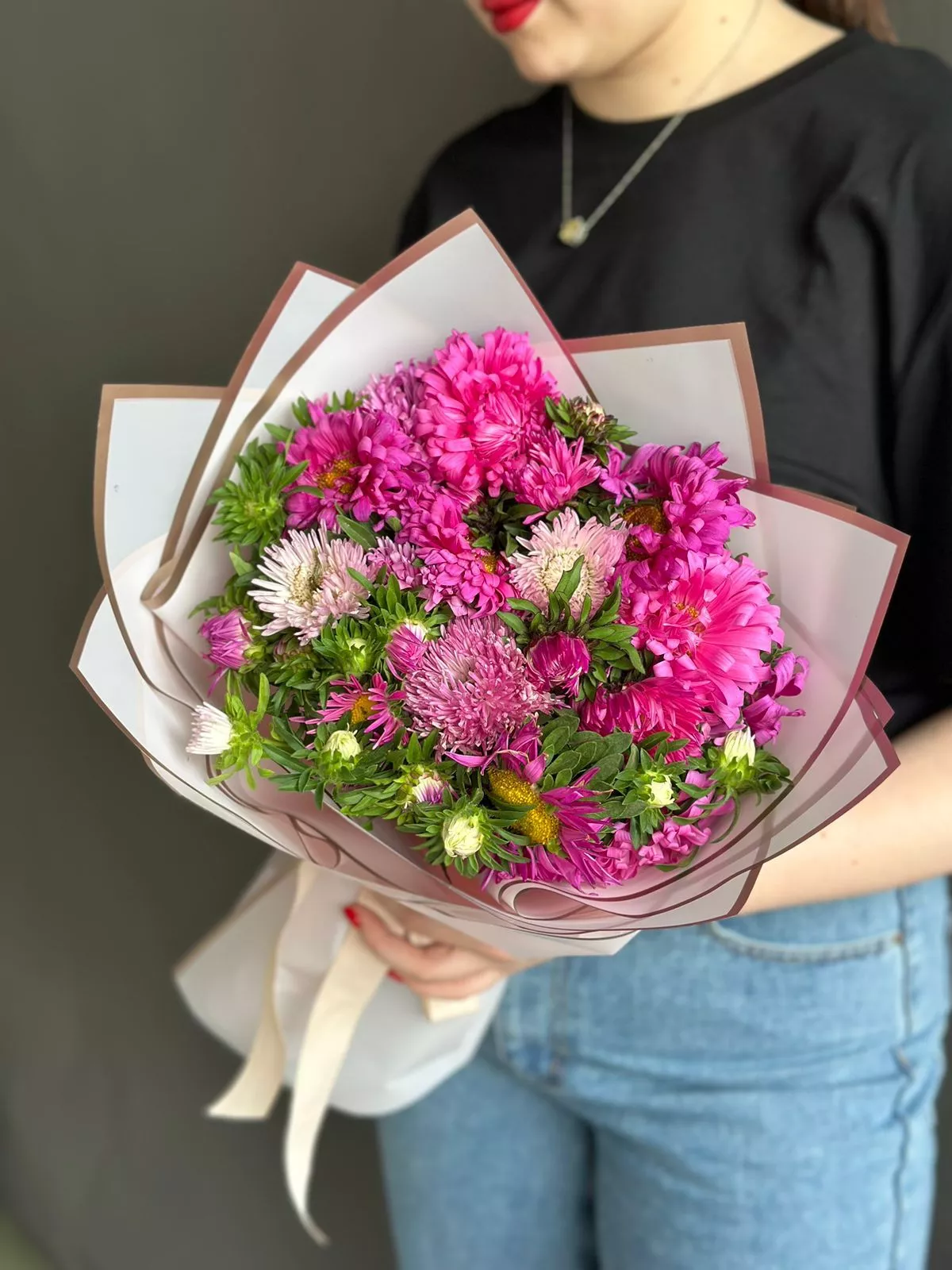 Моно букет из астры в стильном оформлении. Если Вы хотите подарить незабываемые эмоции дорогому человеку — закажите доставку цветов в Zakazbuketovkz