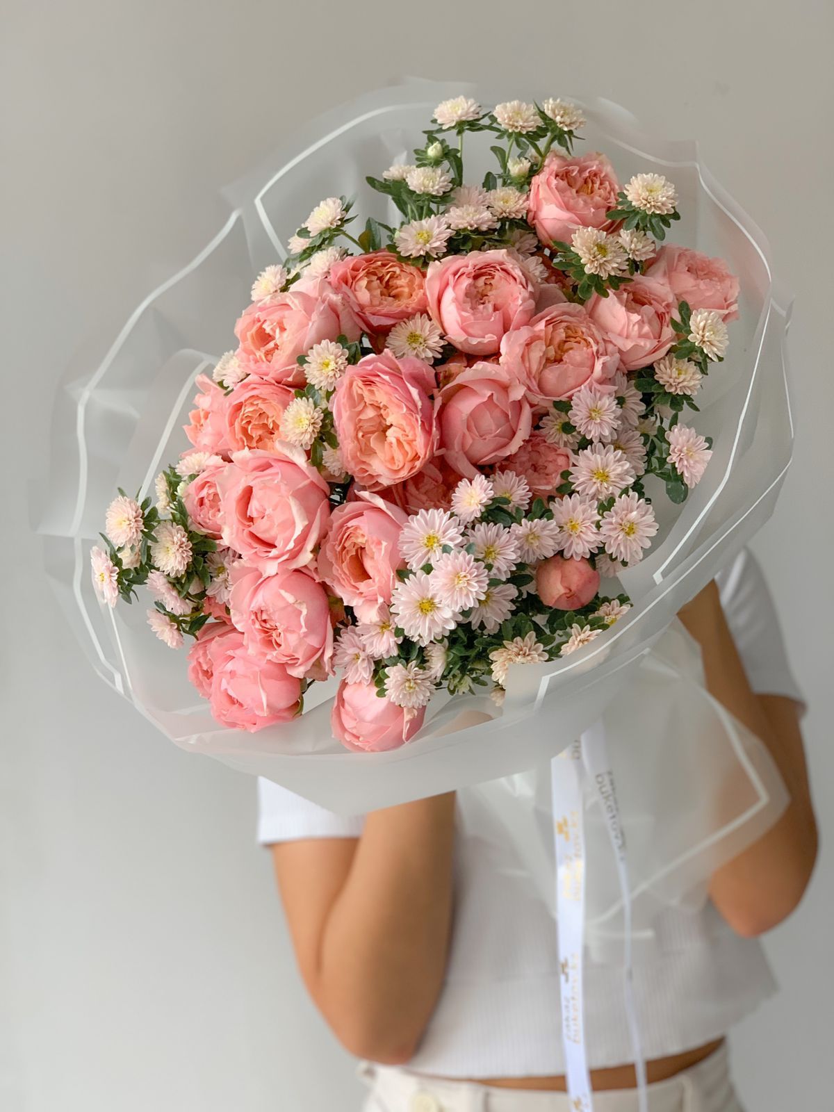 Романтичный букет из астры и пионовидной спрей розы в стильном оформлении. Если Вы хотите подарить незабываемые эмоции дорогому человеку — закажите доставку цветов в Zakazbuketovkz