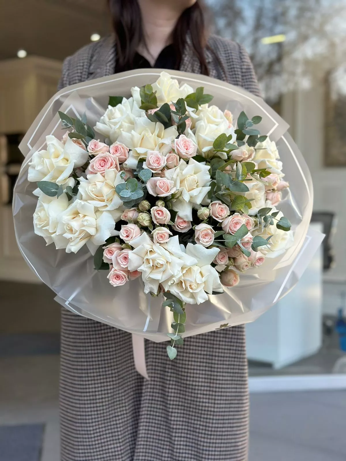 Шикарный букет "Мелисса" из нежных голландских роз, спрей роз и эвкалипта в стильном оформлении. Если Вы хотите подарить незабываемые эмоции дорогому человеку — закажите доставку цветов в Zakazbuketovkz